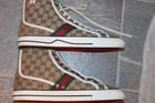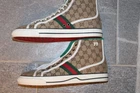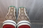 The Gucci Men's Tennis 1977 Canvas High-Top Sneakers are a stylish and comfortable choice for casual wear. Made in Italy, these sneakers feature a beige canvas fabric with a leather upper, lace-up closure, and a comfortable canvas lining. The design includes the iconic Gucci 1977 model, showcasing the brand's signature style. With a size 8.5 UK, 11.5 US, 41 EU, and 11 AU, these sneakers are a versatile option for men looking for a fashionable and high-quality footwear choice. This have been worn ONCE to a concert, slight wear and discoloration on soles, would likely wash off with some soap & scrubbing. The sizing on these is between 11.5-12. The unlaced shoe DOES have laces, just unlaced to get a better view of the tongue and inside of shoe. Can ship with original Gucci box, but this may cause the shipping price to increase, will include the original dust bags.