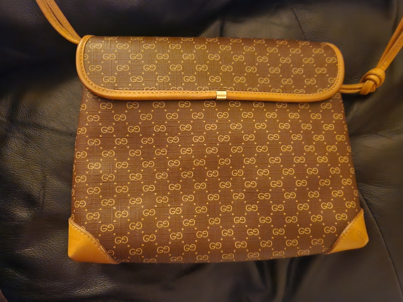 This crossbody bag is a perfect blend of style and function! The Gucci monogram canvas and leather trim give it a luxurious feel, while the gold hardware adds a chic touch. The size is just right for essentials, and the zip closure keeps everything secure. The beige lining and brown strap make it versatile for any outfit. Love how effortlessly it elevates my look!