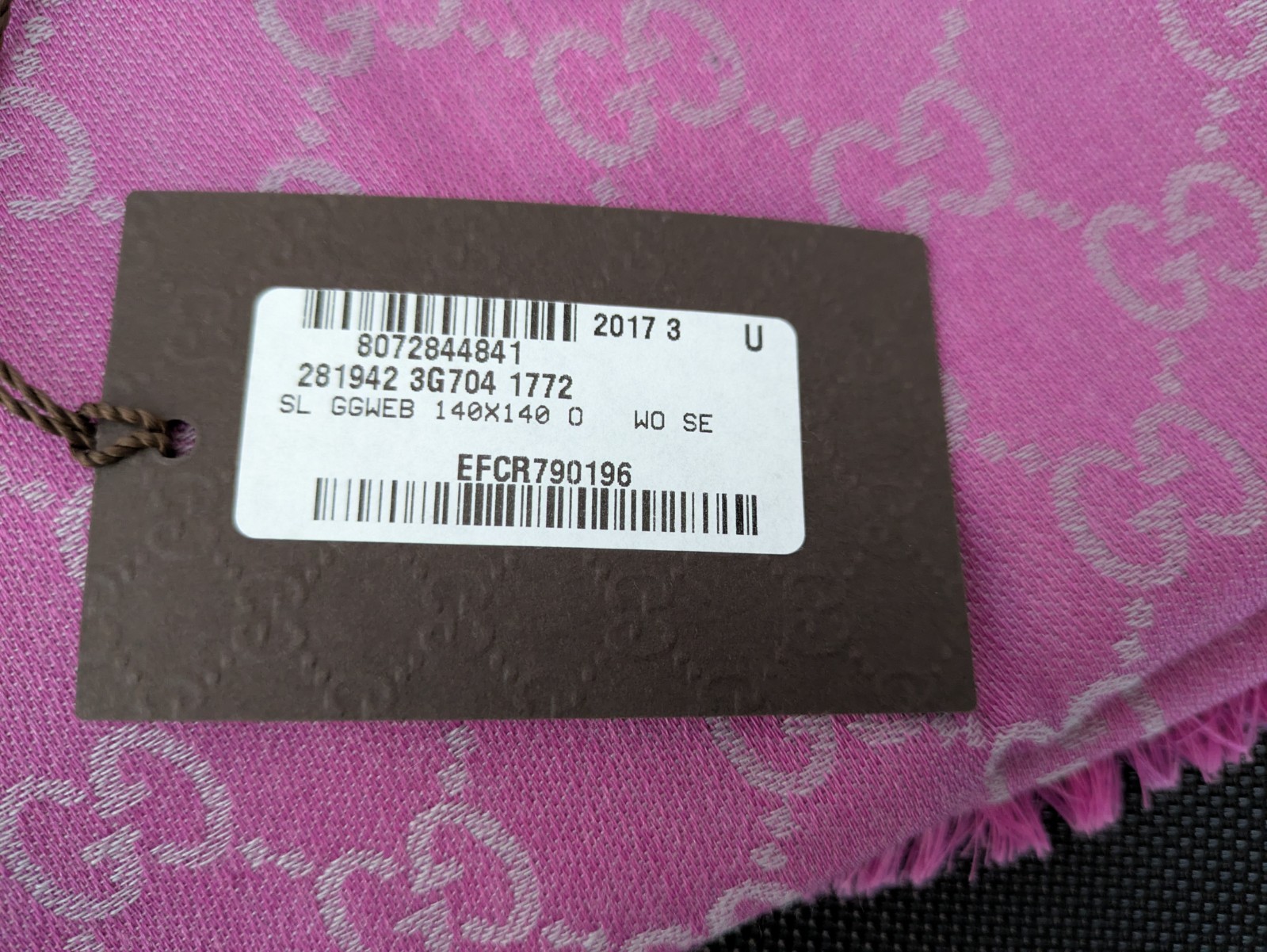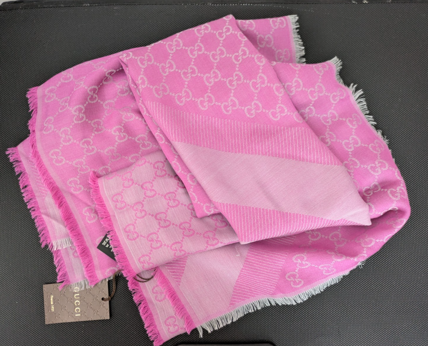 Gucci Monogram Pink Silk Wool Pashmina Scarf New with Tags Made in Italy in 2017 Size 140 cm X 140 cm 80% wool 20% silk Box not included Professional dry clean only Please see photos for details and condition
