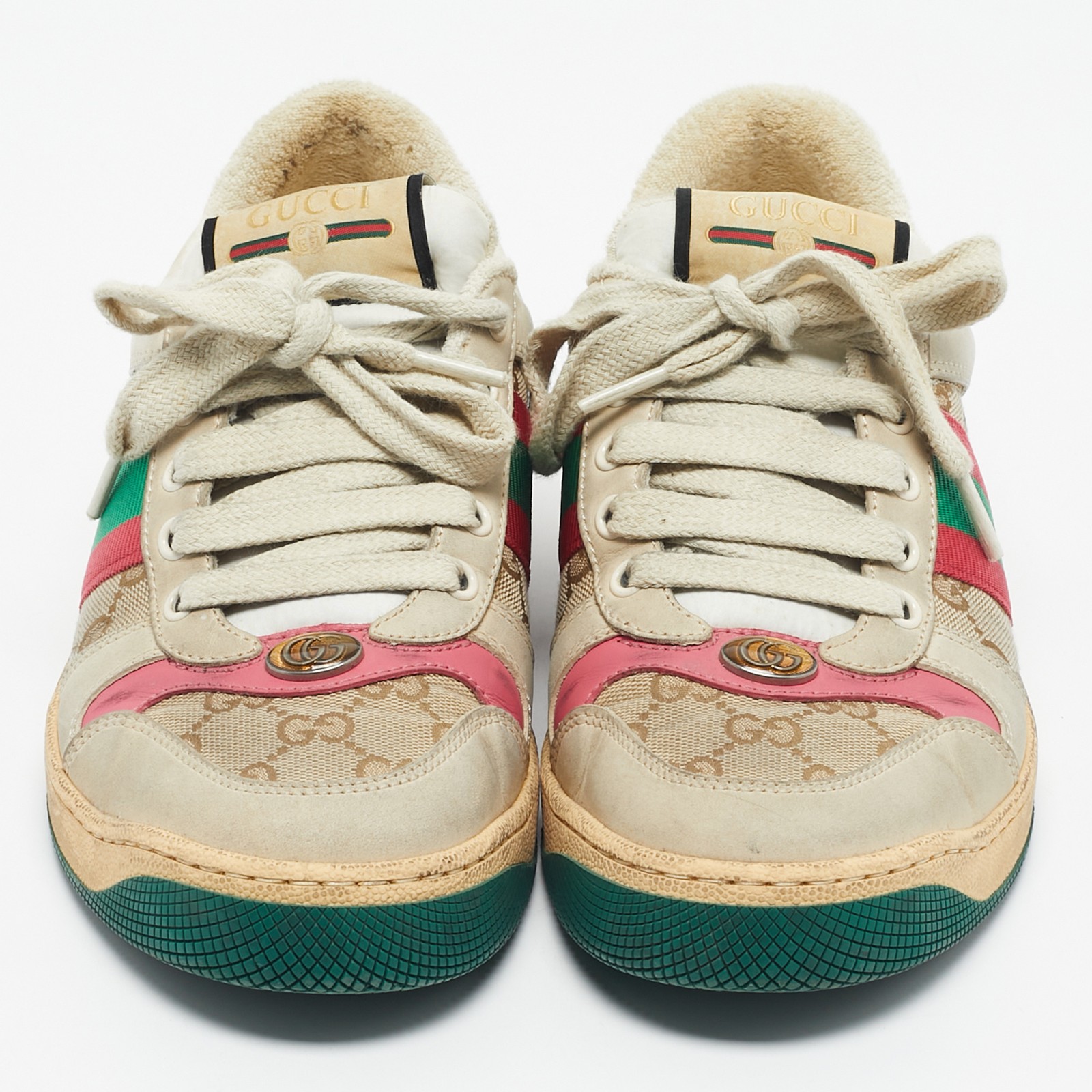 These Screener sneakers blend heritage and street style with layered textures and branding. The mix of nubuck and canvas adds depth to their retro sport aesthetic.Certified by The Luxury Closet - This item has gone through a detailed authentication process overseen by our experts. We offer a lifetime guarantee of authenticity on all our items. Import duties, taxes and charges are not included in the item price. These charges are the buyers responsibility. Please check with your country’s customs office to determine what these additional cost will be prior to buying. Our eBay Store About Us Contact Us Add to Favorite Sellers Gucci Multicolor Nubuck Leather and GG Canvas Screener Sneakers Size 38.5 $288.2 These Screener sneakers blend heritage and street style with layered textures and branding. The mix of nubuck and canvas adds depth to their retro sport aesthetic. Product Details Brand Color Multicolor Dimensions Material Canvas, Leather, Nubuck Leather Size 38.5 Outsole Width Outsole Length Heel Height Includes Certified by The Luxury Closet This item has gone through a detailed authentication process overseen by our experts. We offer a lifetime guarantee of authenticity on all our items. How We Check The in-house team of experts at The Luxury Closet is highly trained to verify the authenticity and the condition of the luxury products. They ensure that only 100% authentic items are put on sale.The evaluation process is unique with its own mix of assessment criteria and differs according to the category. Each item is evaluated based on the following combination of hallmarks, hardware, stitching, symmetry, material, craftsmanship, stamping, codes, hologram stickers, and packaging. Our authenticators also check if the items have been modified or amended (e.g., aftermarket diamonds, replaced batteries, repaired bags, etc.) International Buyers Import duties, taxes and charges are not included in the item price. These charges are the buyers responsibility. Please check with your country’s customs office to determine what these additional cost will be prior to buying.