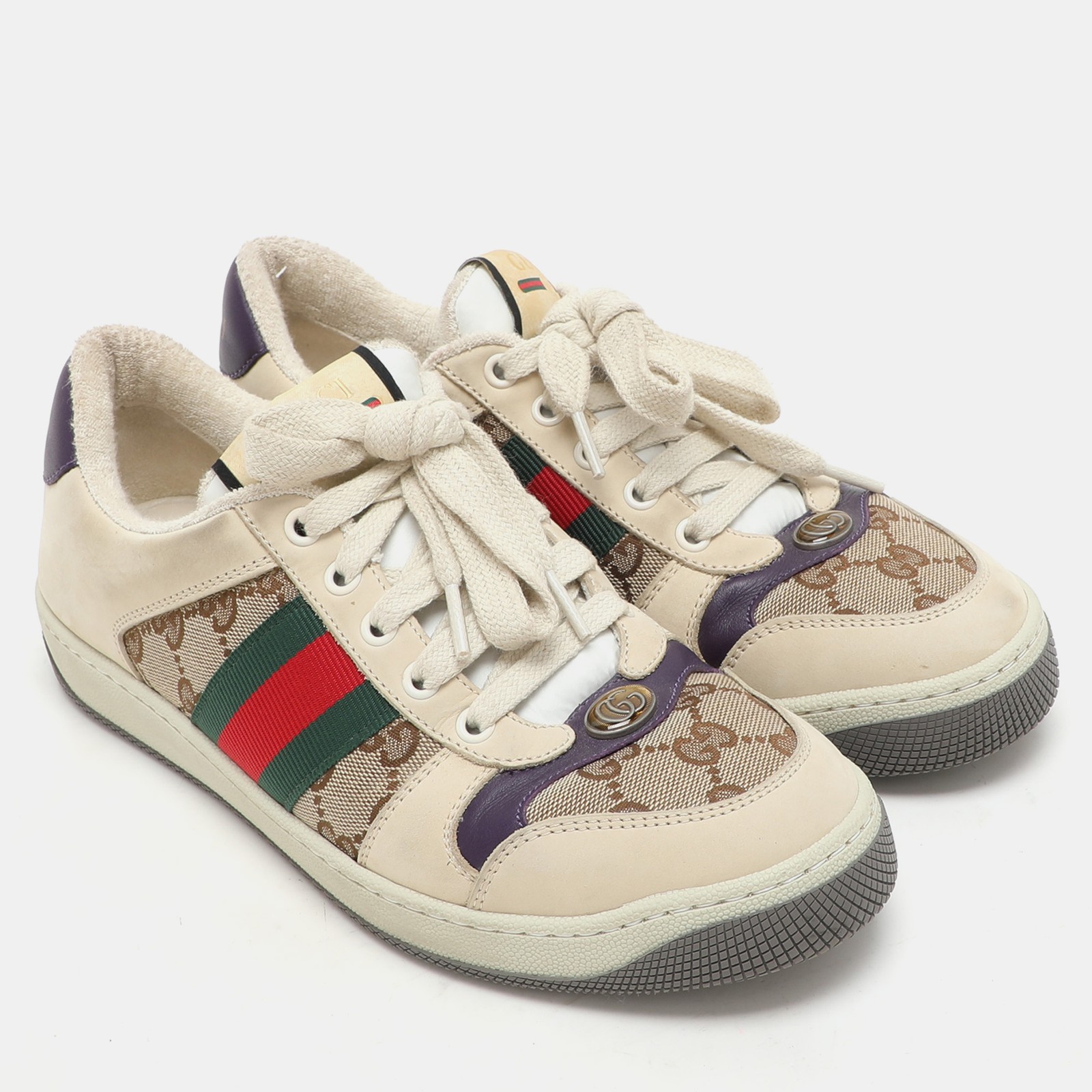 Retro sportswear gets a luxe update in Gucci’s Screener sneakers, crafted from nubuck leather and GG canvas. With vintage inspired paneling and branding, this pair exudes nostalgic flair while staying rooted in high fashion.Certified by The Luxury Closet - This item has gone through a detailed authentication process overseen by our experts. We offer a lifetime guarantee of authenticity on all our items. Import duties, taxes and charges are not included in the item price. These charges are the buyers responsibility. Please check with your country’s customs office to determine what these additional cost will be prior to buying. Our eBay Store About Us Contact Us Add to Favorite Sellers Gucci Multicolor Nubuck Leather and Canvas Screener Sneakers Size 38.5 $548.9 Retro sportswear gets a luxe update in Gucci’s Screener sneakers, crafted from nubuck leather and GG canvas. With vintage inspired paneling and branding, this pair exudes nostalgic flair while staying rooted in high fashion. Product Details Brand Color Multicolor Dimensions Material Canvas, Leather, Nubuck Leather Size 38.5 Outsole Width Outsole Length Heel Height Includes Certified by The Luxury Closet This item has gone through a detailed authentication process overseen by our experts. We offer a lifetime guarantee of authenticity on all our items. How We Check The in-house team of experts at The Luxury Closet is highly trained to verify the authenticity and the condition of the luxury products. They ensure that only 100% authentic items are put on sale.The evaluation process is unique with its own mix of assessment criteria and differs according to the category. Each item is evaluated based on the following combination of hallmarks, hardware, stitching, symmetry, material, craftsmanship, stamping, codes, hologram stickers, and packaging. Our authenticators also check if the items have been modified or amended (e.g., aftermarket diamonds, replaced batteries, repaired bags, etc.) International Buyers Import duties, taxes and charges are not included in the item price. These charges are the buyers responsibility. Please check with your country’s customs office to determine what these additional cost will be prior to buying.