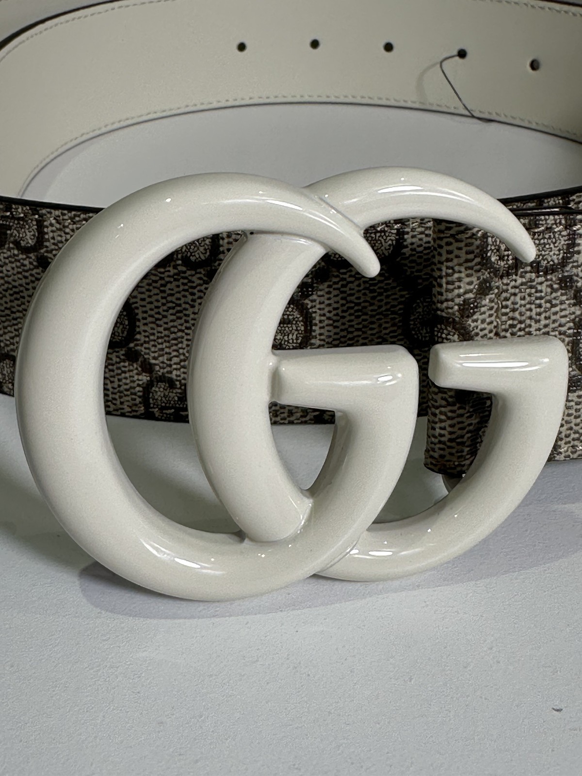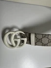 Gucci GG Supreme White Buckle Belt Size: 110 cm / 44 inch Color: Beige/ebony GG canvas with white leather trim and interior Buckle: White Marmont Double G Material: GG Supreme coated canvas and leather Made in Italy Condition: New with tags Includes: Gucci dustbag