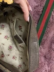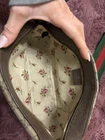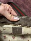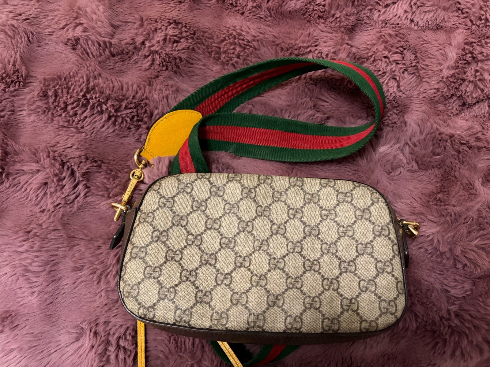 This is an authentic GUCCI GG Supreme Monogram Web Neo Vintage Shoulder Bag in Beige, New Acero and Crop. This stylish messenger bag is crafted of classic brown on beige Gucci GG monogram coated canvas, with dark brown leather trim, and an oval Gucci tag with an aged gold tiger head on the front. The bag features a green and red web stripe canvas shoulder strap with aged gold clasps and yellow leather trim. The yellow leather tasseled top zipper opens to a beige flower print fabric interior with a patch pocket. Sold as is. See pictures. It was heavily used for about 2 years before being put in storage.