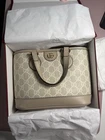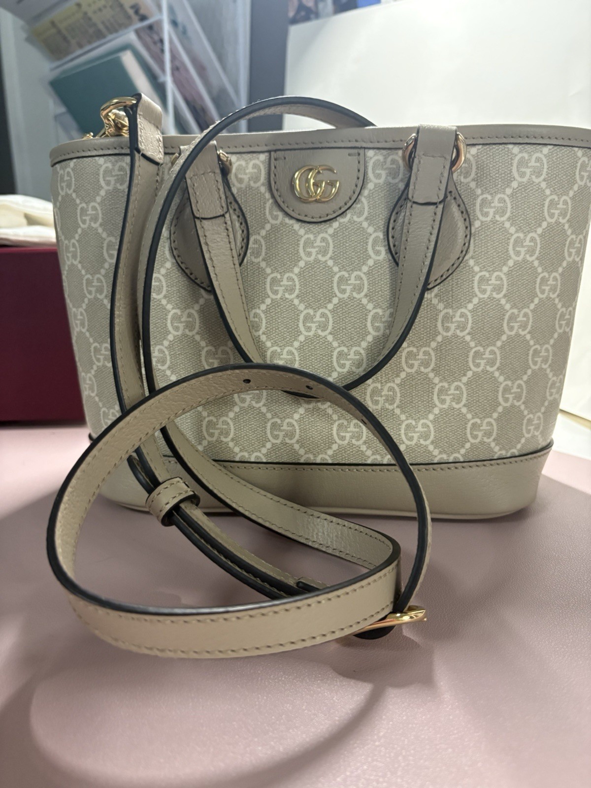 Hello! Up for sale is a Gucci Ophidia Small Tote Bag in beige and white GG Supreme pattern and color. It is in brand new condition. No stains, no scratches. Everything is in pristine condition. Will come with the bag, detachable wristlet, original dust bag, receipts, gucci shopping bag as pictured. Only used once (for an hour). Perfect size for a crossbody or shoulder bag. Straps are adjustable. Retails $1750 plus tax. Asking $1500 OBO plus shipping fee. Specs below: Beige and white GG Supreme Oatmeal leather trim Gold-toned hardware Brown cotton linen lining Double G Detachable internal pouch Handle drop: 3.9" Detachable and adjustable shoulder strap drop: 21.2"; Length: 19.3" - 20" 8.7"W x 7.1"H x 3.9"D Weight: 1.1lbs, approximately Made in Italy The model is 5'7" tall Fits iPhone Pro Max/Plus, Airpods, long wallet, lipstick, and more