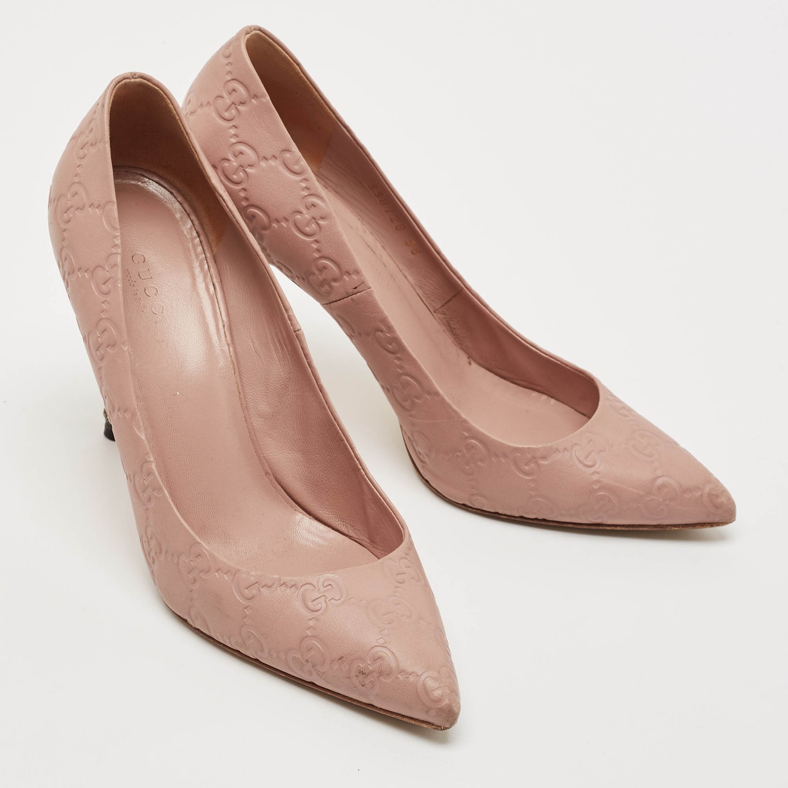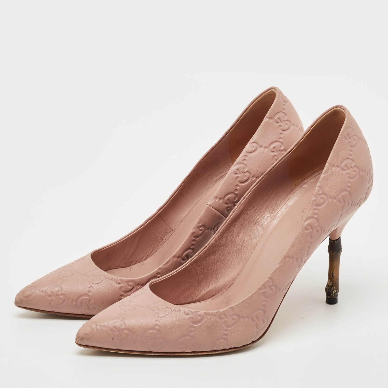 Our eBay Store About Us Contact Us Add to Favorite Sellers Gucci Pale Pink Guccissima Leather Kristen Bamboo Heel Pointed Toe Pumps Size 38 Soft pink leather meets signature Guccissima embossing and a sculptural bamboo heel. Feminine with a distinct Gucci twist. Product Details Brand Gucci Color Pink Includes The Luxury Closet Packaging Outsole Length 23.5 cm Outsole Width 7.5 cm Size 38 Certified by The Luxury Closet This item has gone through a detailed authentication process overseen by our experts. We offer a lifetime guarantee of authenticity on all our items. How We Check The in-house team of experts at The Luxury Closet is highly trained to verify the authenticity and the condition of the luxury products. They ensure that only 100% authentic items are put on sale.The evaluation process is unique with its own mix of assessment criteria and differs according to the category. Each item is evaluated based on the following combination of hallmarks, hardware, stitching, symmetry, material, craftsmanship, stamping, codes, hologram stickers, and packaging. Our authenticators also check if the items have been modified or amended (e.g., aftermarket diamonds, replaced batteries, repaired bags, etc.) International Buyers Import duties, taxes and charges are not included in the item price. These charges are the buyers responsibility. Please check with your country’s customs office to determine what these additional cost will be prior to buying.