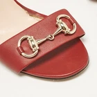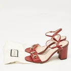 Bold and feminine, the Gucci Claudie sandals in red leather are a striking choice for any occasion. Featuring a sleek ankle strap and a Horsebit motif on the vamps, these sandals are equal parts comfortable and glamorous.Certified by The Luxury Closet - This item has gone through a detailed authentication process overseen by our experts. We offer a lifetime guarantee of authenticity on all our items. Import duties, taxes and charges are not included in the item price. These charges are the buyers responsibility. Please check with your country’s customs office to determine what these additional cost will be prior to buying. Our eBay Store About Us Contact Us Add to Favorite Sellers Gucci Red Leather Claudie Ankle Strap Sandals Size 38.5 $255.2 Bold and feminine, the Gucci Claudie sandals in red leather are a striking choice for any occasion. Featuring a sleek ankle strap and a Horsebit motif on the vamps, these sandals are equal parts comfortable and glamorous. Product Details Brand Color Red Dimensions Material Leather Size 38.5 Outsole Width 8 cm Outsole Length 24 cm Heel Height 8.5 cm Includes Original Dustbag Certified by The Luxury Closet This item has gone through a detailed authentication process overseen by our experts. We offer a lifetime guarantee of authenticity on all our items. How We Check The in-house team of experts at The Luxury Closet is highly trained to verify the authenticity and the condition of the luxury products. They ensure that only 100% authentic items are put on sale.The evaluation process is unique with its own mix of assessment criteria and differs according to the category. Each item is evaluated based on the following combination of hallmarks, hardware, stitching, symmetry, material, craftsmanship, stamping, codes, hologram stickers, and packaging. Our authenticators also check if the items have been modified or amended (e.g., aftermarket diamonds, replaced batteries, repaired bags, etc.) International Buyers Import duties, taxes and charges are not included in the item price. These charges are the buyers responsibility. Please check with your country’s customs office to determine what these additional cost will be prior to buying.