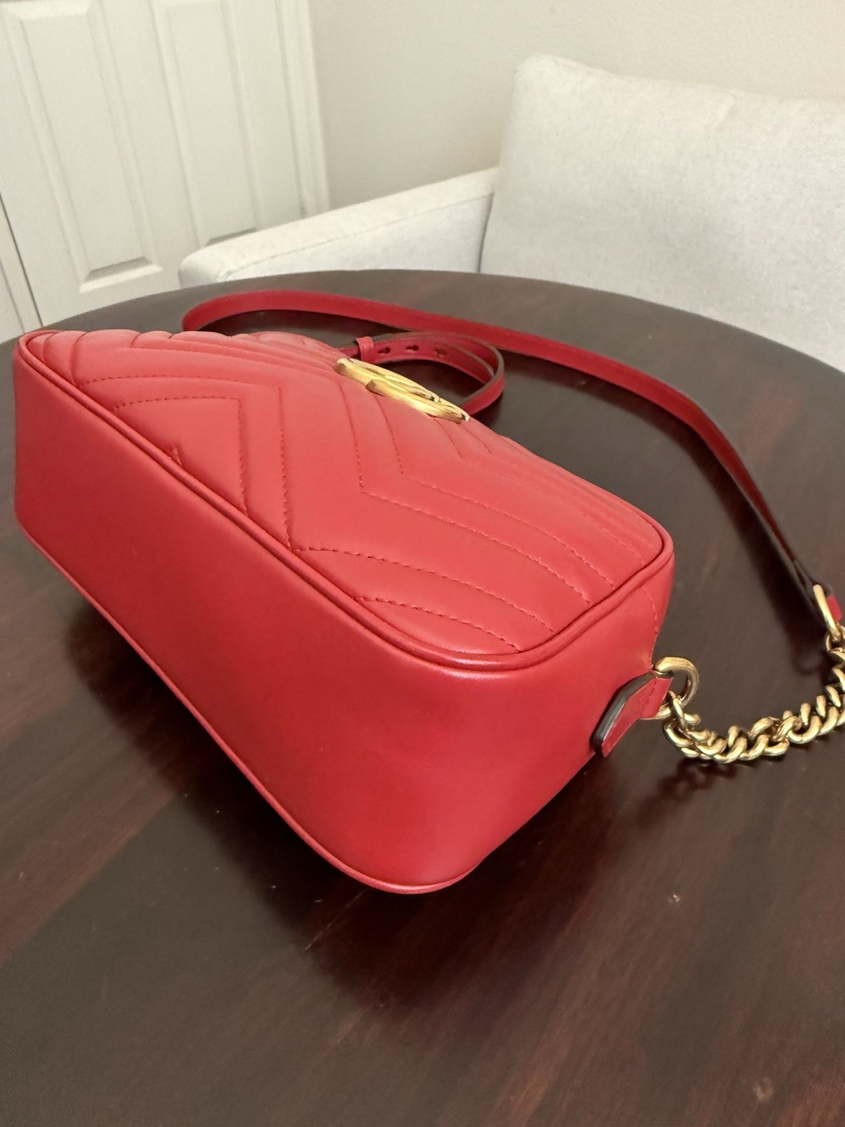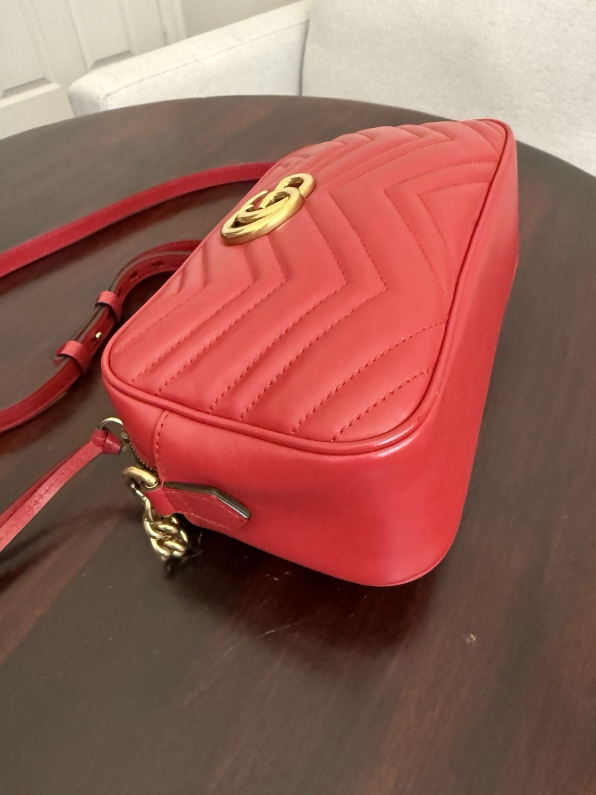 -GG Marmont small camera bag Dark Red -serious# 447632 520981 -Made in Italy -Zipper runs well -No cracks -No odors or stains _Exterior Good condition _Inside There is a little lipstick stain as shown in the photos.