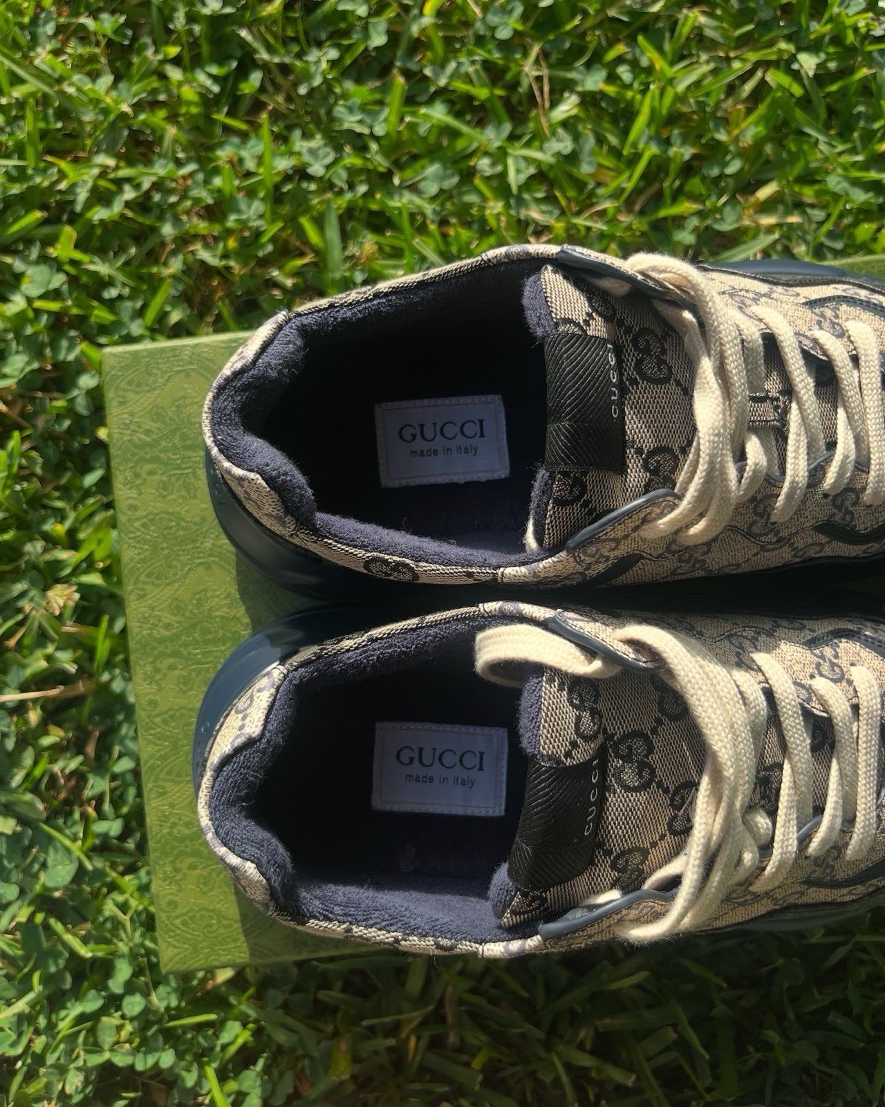 The Gucci Rhyton GG sneakers for men feature a beige color with a Gucci print pattern, making them a stylish and unique addition to any wardrobe. Made with leather upper material and lining, these lace-up shoes offer both comfort and durability. The rubber outsole provides traction, while the leather and fabric insole ensures a cushioned and lined fit. Perfect for casual wear, these sneakers are designed with the signature Gucci GG Rhyton model, embodying a dreamy and blue character in every step.