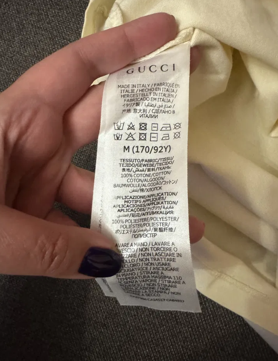 The Gucci Sequin Logo Ivory Cotton Short Sleeve T-Shirt in size M is a statement piece of women's clothing. Made from comfortable cotton material, this t-shirt features a stylish logo design accented with sequins, adding a touch of glamour to the classic ivory color. With short sleeves and made for regular sizing, this top is perfect for adding a touch of luxury to your everyday wardrobe.