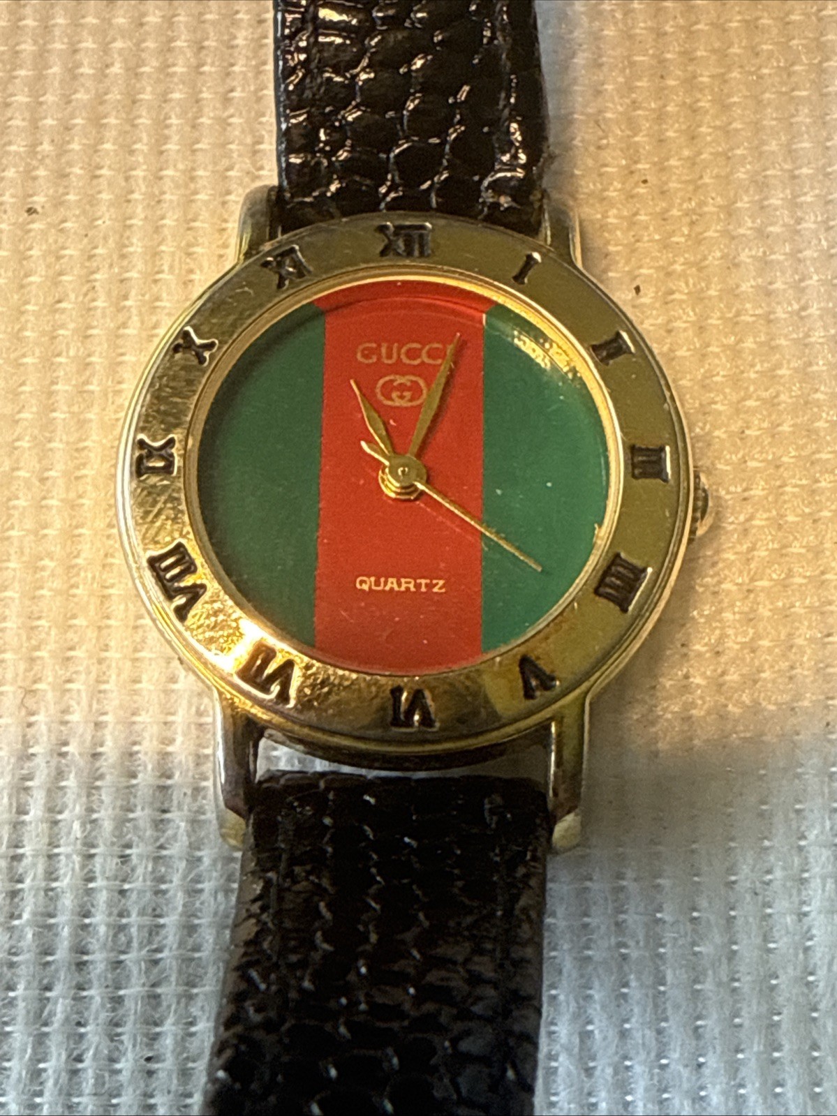 Gucci Watch Ladies Round Shelly Line Gold Quartz Vintage 24 mm Works good New Battery Installed 4/11/25 Please see pictures as they are part of the description
