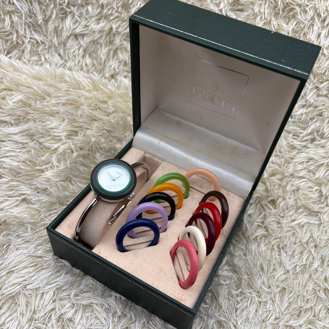 Gucci Silver Change bezel 11/12.2L Change Bezel 12 colors Womens Vintage w/ Box Description Condition: used This is a Gucci 11/12.2 watch. Comes with box. There are some small scratches on the dial. All my products are 100% Authentic. Please feel free to contact us if you have any question. Please check the picture. Payment Please pay within 5 days after the auction closed. Shipping About other area, please ask me. When you purchase two or more my items, I can send them together and discount shipping cost. Returns Returns are accepted ONLY if the item was not the item described. International Buyers - Please Note: * Import duties, taxes and charges are not included in the item price or shipping charges. These charges are the buyer's responsibility. * Please check with your country's customs office to determine what these additional costs will be prior to bidding/buying. * These charges are normally collected by the delivering freight (shipping) company or when you pick the item up - do not confuse them for additional shipping charges. * We do not mark merchandise values below value or mark items as "gifts" - US and International government regulations prohibit such behavior. Important Notice For U.S. Buyers For shipments to the US: Import duties and taxes are already included in the item price, so there will be no additional charges upon delivery. Note: For items valued over $2,500 USD, a formal entry may be required by U.S. Customs, and duties and/or taxes may apply, which must be paid by the buyer, even for shipments to the United States. For Buyers Outside the US: Import duties, taxes, and charges are not included in the item price or shipping cost. These fees are the buyer's responsibility. Please check with your country's customs office to determine what these additional costs may be prior to bidding or purchasing. These import-related payments are the buyer's responsibility in accordance with eBay's Terms and Conditions.