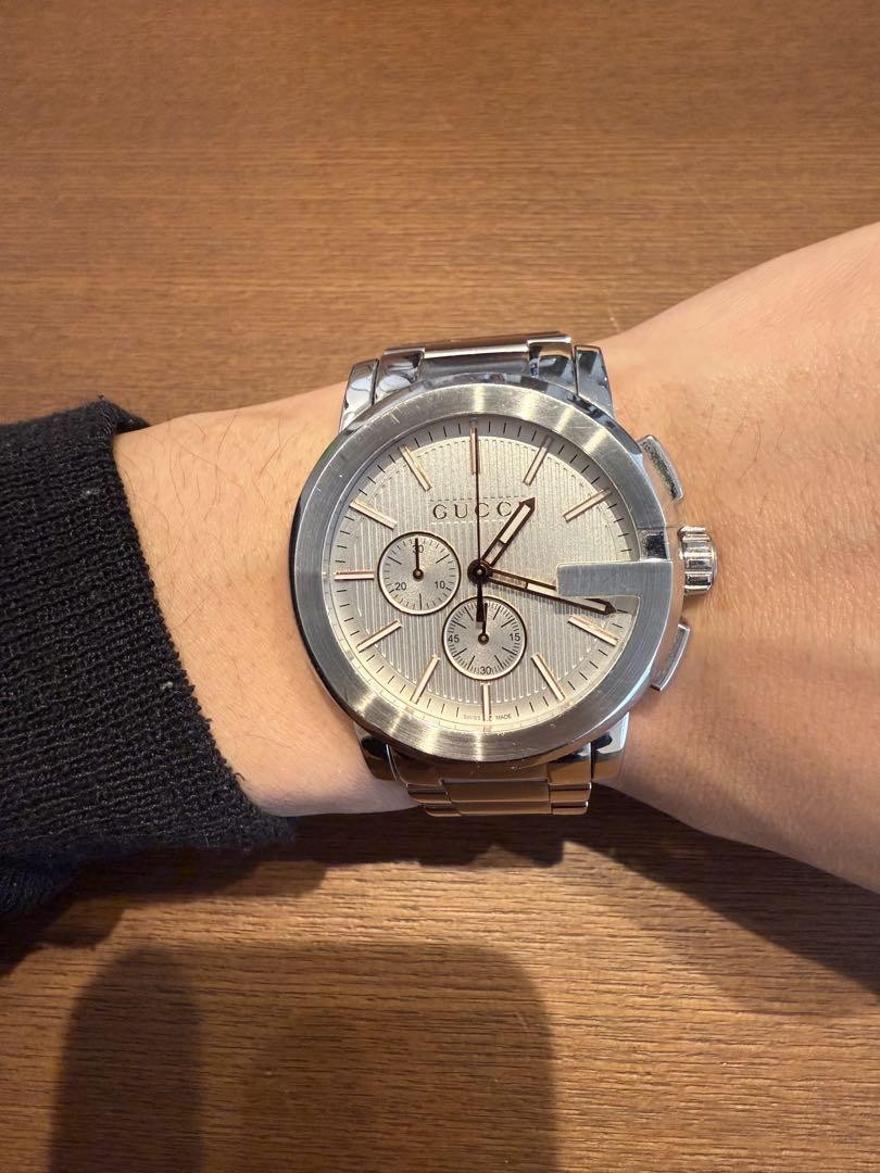 Absolutely love this Gucci chronograph—sleek silver design, perfect weight, and looks luxurious on the wrist. The craftsmanship is impeccable, and it arrived quickly from Japan, well-packaged. A must-have for watch enthusiasts! No regrets at all.