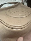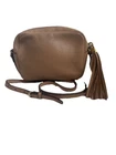 The Gucci Camel Pebbled Calfskin Disco Bag Small Soho Crossbody is a stylish and luxurious crossbody bag designed for women. Made with high-quality pebbled calfskin leather in a rich camel color, this small-sized bag features gold hardware accents and a trendy tassel detail. The brown leather handle/strap adds a touch of elegance, while the zip closure ensures your belongings are secure. With its chic design and designer theme from Italy, this Gucci crossbody bag is a perfect accessory for any occasion, making it a must-have for fashion-forward individuals.