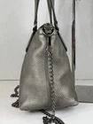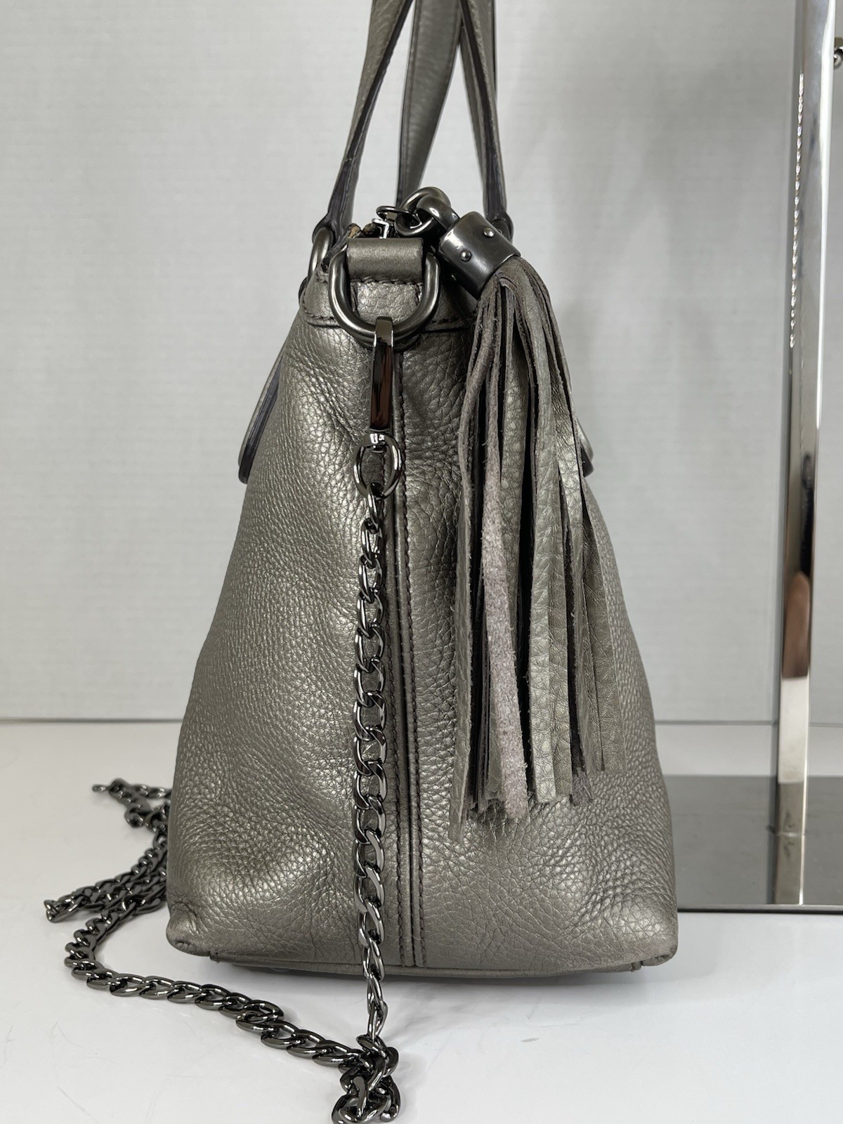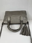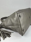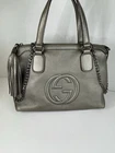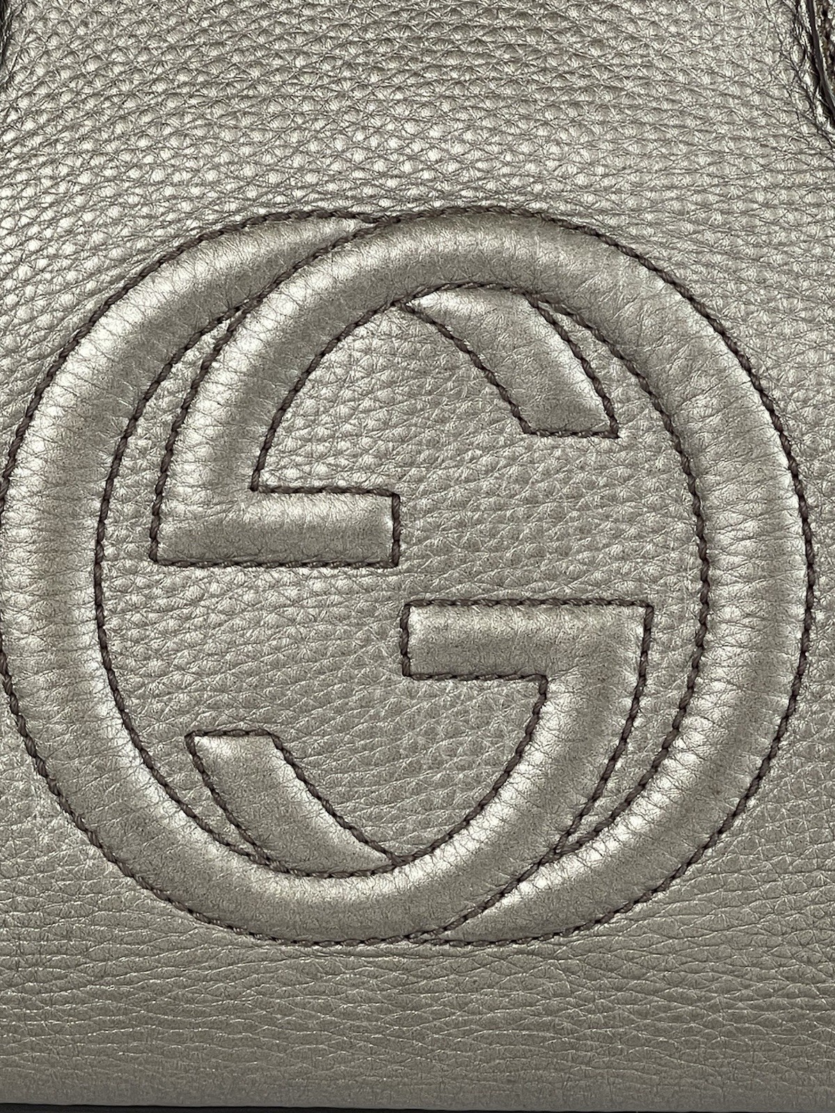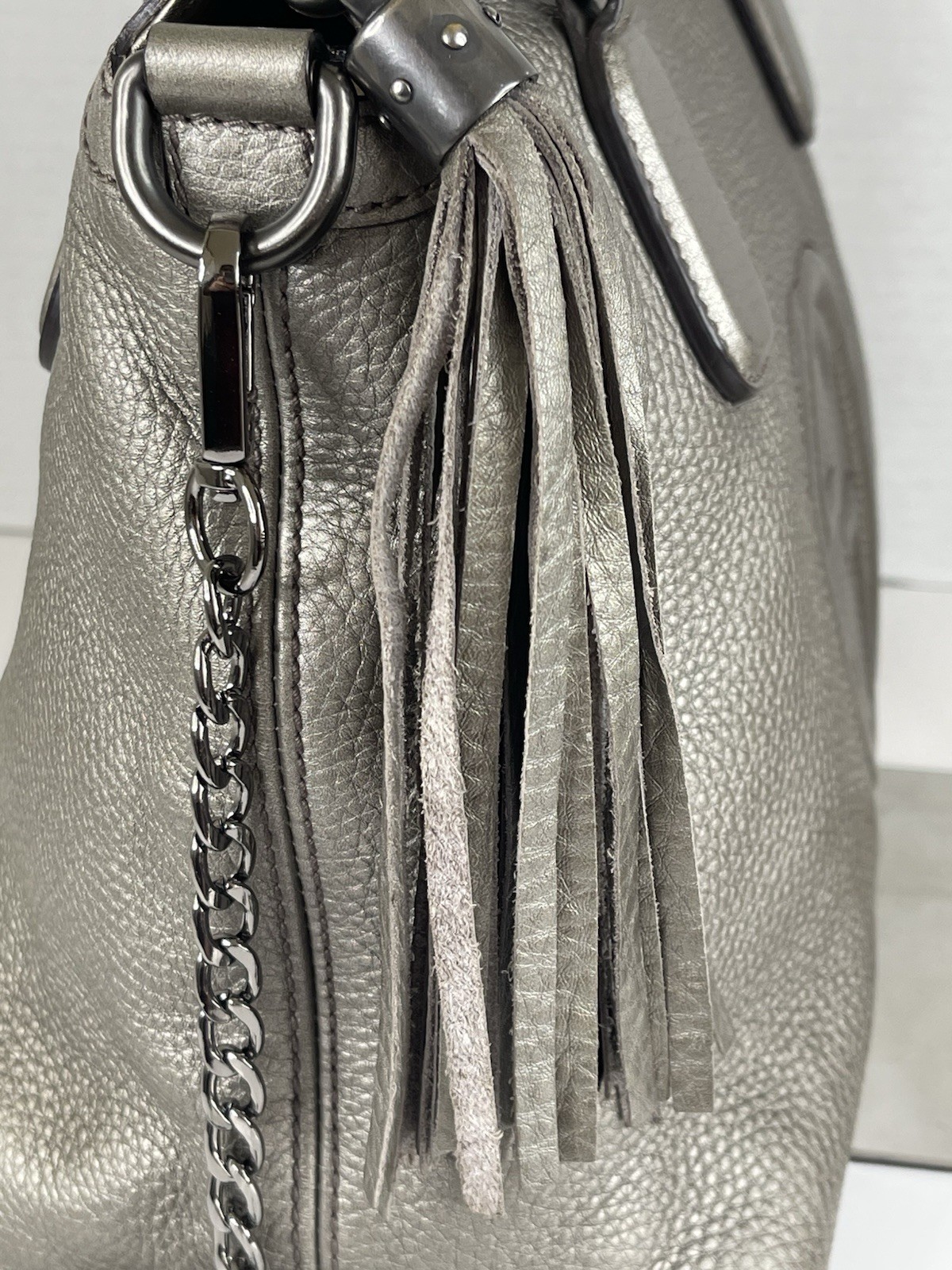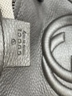 The Gucci Soho Tote with Zipper is a stylish handbag designed for women, made with high-quality leather in a sophisticated gray color. This spacious bag features a zippered closure, a comfortable handle strap drop, and is crafted in Italy, known for its excellence in luxury goods. With a width of 14.9 inches, height of 9.05 inches, and depth of 5.51 inches, this Gucci tote is the perfect size for carrying all your essentials in style. UNBRANDED CROSSBODY CHAIN, dirty spots on the inside