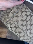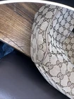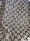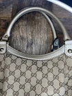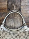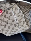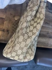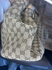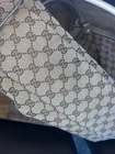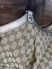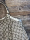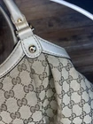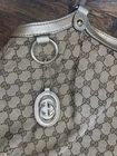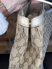 This is a Gucci Sukey tote bag with champagne leather trim, featuring the iconic Gucci GG pattern on beige canvas. Made in Italy, the bag includes a bag charm accessory and inner pockets. The exterior and lining materials are a combination of canvas and leather, with canvas and leather used for the handle/strap as well. The style is designer-themed and designed for women. No dust bag. No box. See pictures.
