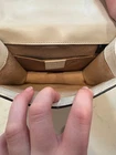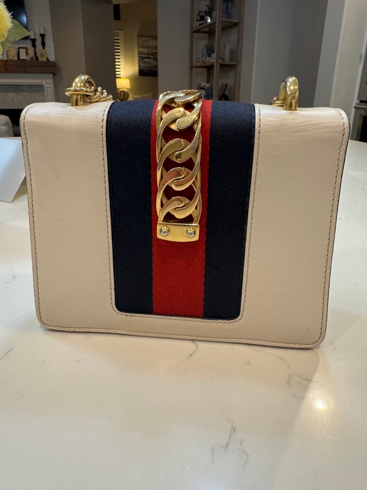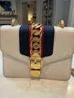 The Gucci Sylvie Mini Ivory/White Chain Crossbody Bag is a designer piece from Gucci, featuring a square shape with a snap closure. The bag has a gold chain crossbody strap and accents, along with a web pattern and Gucci branding. Made from leather with a suede lining in a beige color, this limited edition bag is perfect for weddings, parties, casual outings, formal events, or business meetings. The bag measures 7 inches in width, 5 inches in height, and 2.5 inches in depth, making it a stylish and versatile accessory for any occasion. Includes 2 brand new Gucci leather Sylvie straps. White and Red. Each is over $300 retail! You get it ALL! The new Gucci straps are over 600 dollars in value!