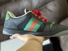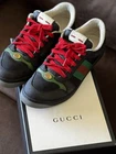 Authentic Men's Pre-Owned Gucci Sneakers with Original Box & Extra Laces - Black with Red/Green Web (Size 9.5 EU / 10 US) Step out in iconic style with these authentic pre-owned men's Gucci sneakers. These stylish low-top sneakers come in a versatile black color, accented with Gucci's signature red and green web stripe on the sides, making them a recognizable statement piece. Key Features: Brand: Gucci Style: Low-top sneakers with red and green web stripe Color: Black with red and green accents Size: Men's Gucci size 9 1/2 (equivalent to approximately US size 10) Condition: Pre-owned, good condition with visible signs of wear consistent with normal use. The soles show some wear, and the insoles have marks from prior use. The outer material and classic Gucci web remain in appealing condition. Material: Features a durable fabric upper with leather trim, and rubber soles. Details: Adorned with the classic GG logo on the front laces and a distinctive bee motif on the rubber outsoles, signifying Gucci's exquisite craftsmanship. Inclusions: Original Gucci Box: Protects and authenticates your purchase. Extra Shoelaces: Includes a brand new, never-used pair of vibrant red shoelaces, still in their original Gucci packaging, allowing for a fresh look or replacement. (The sneakers are currently laced with red laces). These sneakers are perfect for adding a touch of luxury and designer flair to your casual wardrobe. Don't miss the opportunity to own a piece of high fashion at a fantastic value!