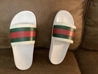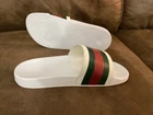 Gucci Men’s Web Stripe White Rubber Pool Slides Size US 7 / EU 40 – Pre-Owned w/ Dust Bag Item Description: Step into luxury with these authentic Gucci men's rubber pool slides , featuring the iconic red and green web stripe across the front. These slides are pre-owned in very good condition , showing only light wear. The original box is not included, but a Gucci dust bag is included for storage and travel. Brand: Gucci Color: White with Signature Red & Green Stripe Material: Rubber Estimated Size: US Men’s 7 / EU 40 (based on outsole measurement of approx. 10 inches – see photo) Condition: Pre-owned – very good condition, no major scuffs, soles in great shape Includes: Gucci dust bag only (no box) 📏 Note: Size is not printed on the slides. Measurement is approx. 10 inches (25.4 cm) in length. Please check your sizing accordingly.