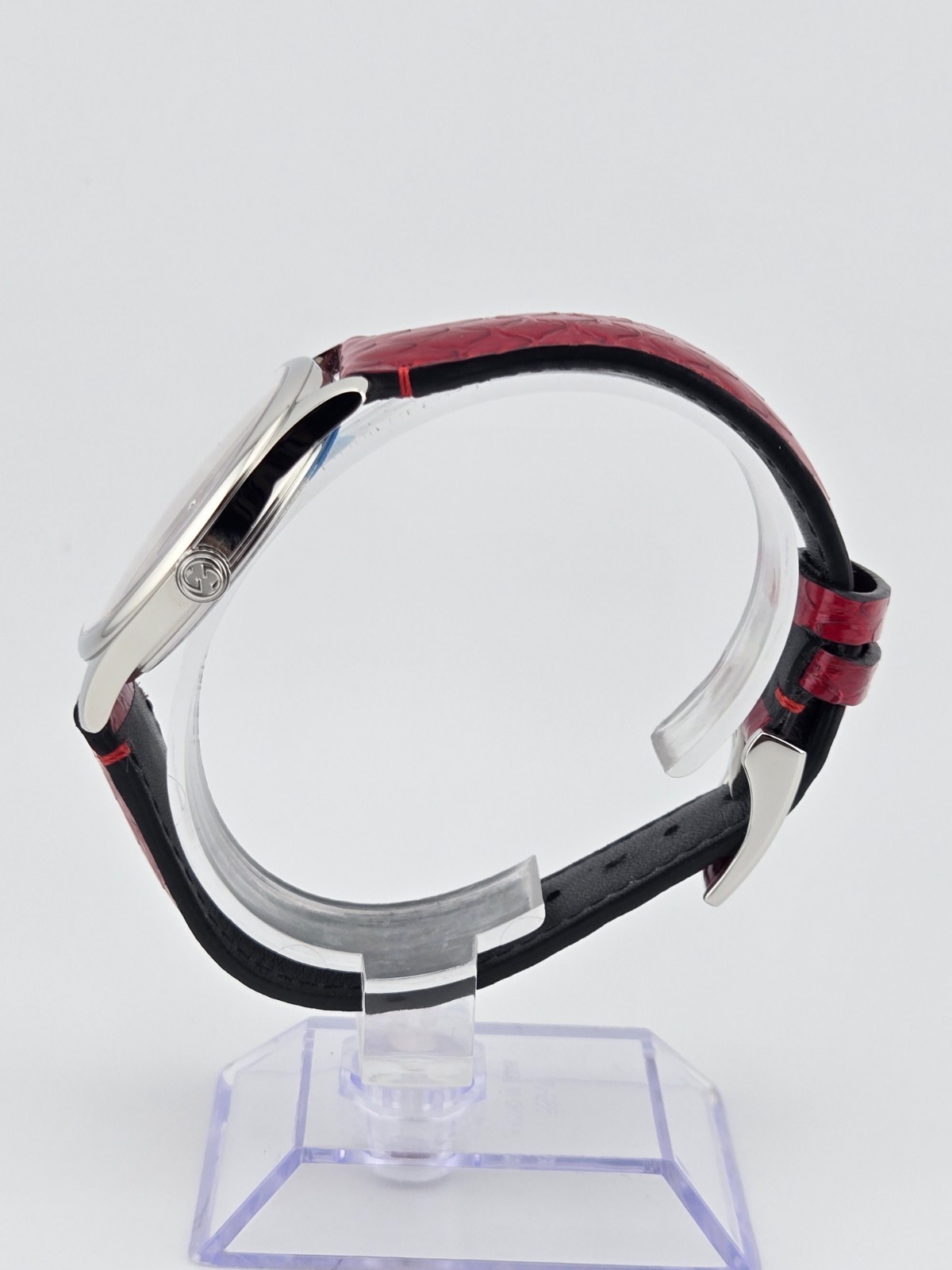 Gucci Women’s G-Timeless Red MOP Dial Leather Band Watch YA1264041A ($1380 MSRP) New with Original Box and Tags! This watch is a Shelf Pull from one of the Major Department Stores. May find few micro scratches on the watch case/band, visible under a direct and strong light. Add a bold pop of luxury to your wrist with the Gucci Women’s G-Timeless Red MOP Dial Leather Band Watch (YA1264041A). This striking timepiece features a polished stainless steel case paired with a vibrant cherry red leather strap, crafted in a refined lizard texture that enhances its bold yet elegant appeal. The fixed stainless steel bezel frames a mesmerizing cherry red mother-of-pearl dial, creating a radiant backdrop for silver-tone hands and unique Gucci charm hour markers that reflect the brand’s signature style. At the heart of the watch is a precise quartz movement, ensuring reliable timekeeping for your day-to-day life. The analog dial includes a subtle date display just above the 6 o’clock position, offering both functionality and clean design. A scratch-resistant sapphire crystal protects the dial, while the pull/push crown and solid case back add to its durability. With a case size of 36 mm and a slim 7 mm thickness, this watch offers a sleek, comfortable fit on the wrist. The 17 mm cherry red leather strap is secured with a tang clasp, blending comfort with chic sophistication. Water-resistant up to 50 meters (165 feet), this watch is suitable for everyday wear, rain or shine. Perfect for both statement moments and refined daily style, the Gucci G-Timeless is a modern classic that exudes confidence, color, and unmistakable luxury. Features Stainless steel case with a cherry red (lizard) leather strap. Fixed stainless steel bezel. Cherry red mother of pearl dial with silver-tone hands and Gucci charms hour markers. Dial Type: Analog. Date display above the 6 o'clock position. Quartz movement. Scratch resistant sapphire crystal. Pull / push crown. Solid case back. Round case shape. Case size: 36 mm. Case thickness: 7 mm. Band width: 17 mm. Tang clasp. Water resistant at 50 meters / 165 feet. Functions: date, hour, minute, second Fast and Free Shipping You're already purchasing the item. Why pay additional for shipping, especially slow shipping? We get your order shipped out within 1-business day and delivered to your doorstep as quickly as possible. Competitive Pricing With our dynamic pricing model, our prices are always competitive. Our prices are some of the lowest that you will find on the internet. Rest assured that you're getting a good deal when purchasing with us. 30-day Money Back Guarantee We are committed to making sure that you leave this transaction satisfied. If you're unhappy with the product for any reason, you may return it back for your money-back or a replacement within 30 days. No questions asked!