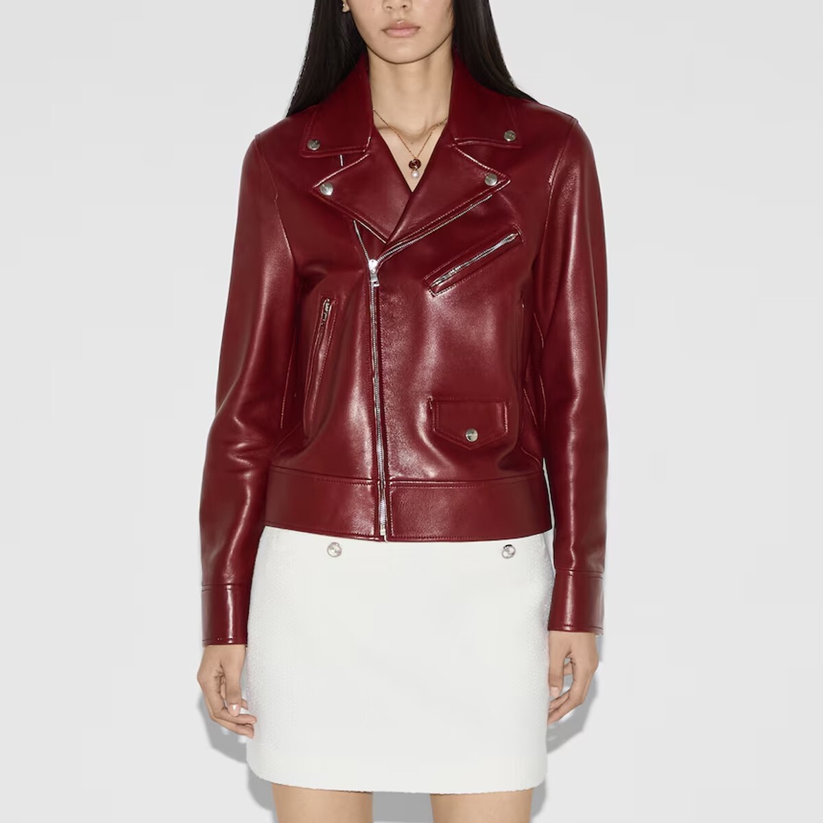 Gucci Women’s Red Cowhide Leather Jacket – Vented Designer Coat Turn heads with this bold and luxurious Gucci Women’s Red Cowhide Leather Jacket , a standout piece that combines high-end fashion with everyday versatility. Made from premium cowhide leather , this designer coat features a sleek, structured fit in a vibrant red hue that radiates confidence and style. Designed with vented panels for enhanced breathability and comfort, this jacket blends fashion-forward design with practical function. Signature Gucci craftsmanship is on full display, from the precise tailoring and smooth leather texture to the branded hardware and refined detailing. Ideal for transitional weather or cool nights out, this vented designer coat pairs effortlessly with denim, trousers, or dresses for a chic, statement-making look. Features: Material: 100% genuine red cowhide leather Design: Feminine, modern cut with structured silhouette Ventilation: Discreet venting for comfort and airflow Closure: Full-length front zip or button closure (style dependent) Details: Branded buttons or zipper pulls, inner lining, and functional pockets Fit: Tailored fit—flattering and true to size Accents: Subtle Gucci logo detailing or embossed leather elements