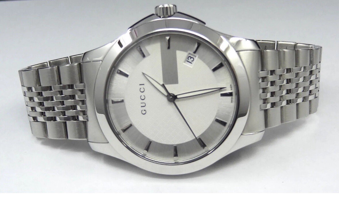 Free shipping from Miami, Florida! Delivery time 1-4 business days Product Details General Color Silver Case Case Size 38 Case Thickness 7 mm Case Material Stainless Steel Case Shape Round Case Back Stainless Steel Band Band Material Stainless Steel Band Type Bracelet Band Color Silver-tone Band Length 7.5 inches Band Width 20 mm Clasp Hidden Deployment Dial Dial Color Silver with Silver Gucci 'G' Type Analog Crystal Scratch Resistant Sapphire Hands Silver-tone Dial Markers Stick Bezel Fixed Bezel Color Silver-tone Bezel Material Stainless Steel Crown Pull / Push Information Brand Gucci Collection Name G-Timeless Gender Mens Model YA126401 Watch Label Swiss Made Movement Quartz Features Water Resistance 30 meters / 100 feet Calendar Date display at the 4 o'clock position Functions Hours, Minutes, Seconds, Calendar Watch Features Stainless Steel