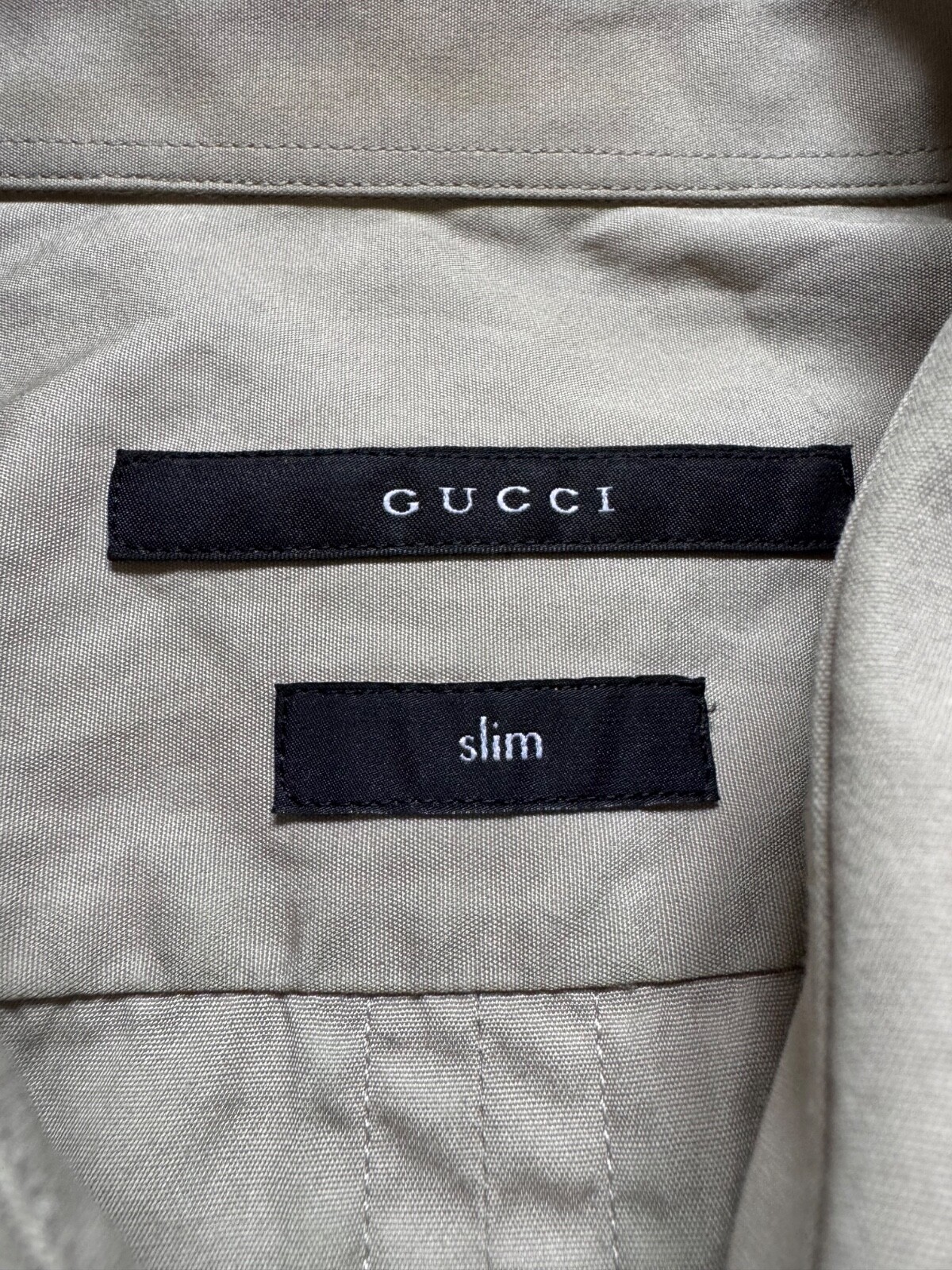 Crafted with meticulous attention to detail, the Gucci Pocket Cherry Line Shirt is a testament to classic designer style and comfort. Rendered in a versatile beige hue, this slim-fit t-shirt features a timeless solid pattern that makes it a perfect staple for any wardrobe. Its long sleeves and luxurious lining offer ample comfort, while the added pockets provide practicality without compromising on style. Tailored in Italy, this size 41 shirt embodies the quality and craftsmanship expected from the Gucci brand. It's designed to cater to the modern man who appreciates designer themes with a nod to traditional aesthetics. Whether it's for a casual day out or a more formal setting, this t-shirt is sure to make a statement.