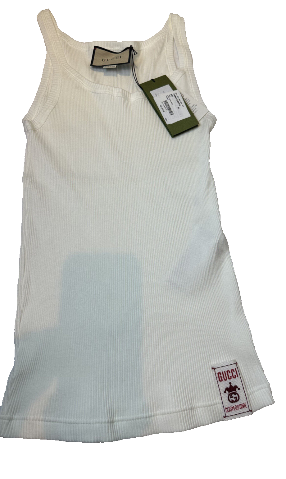 Authentic New with Tags Gucci Tank Top Cotton in a ribbed jersey weave Scoop neck Front logo patch Made in Italy 100% Cotton. Machine wash cold Color: White Code: 714865 XJE9M 9791