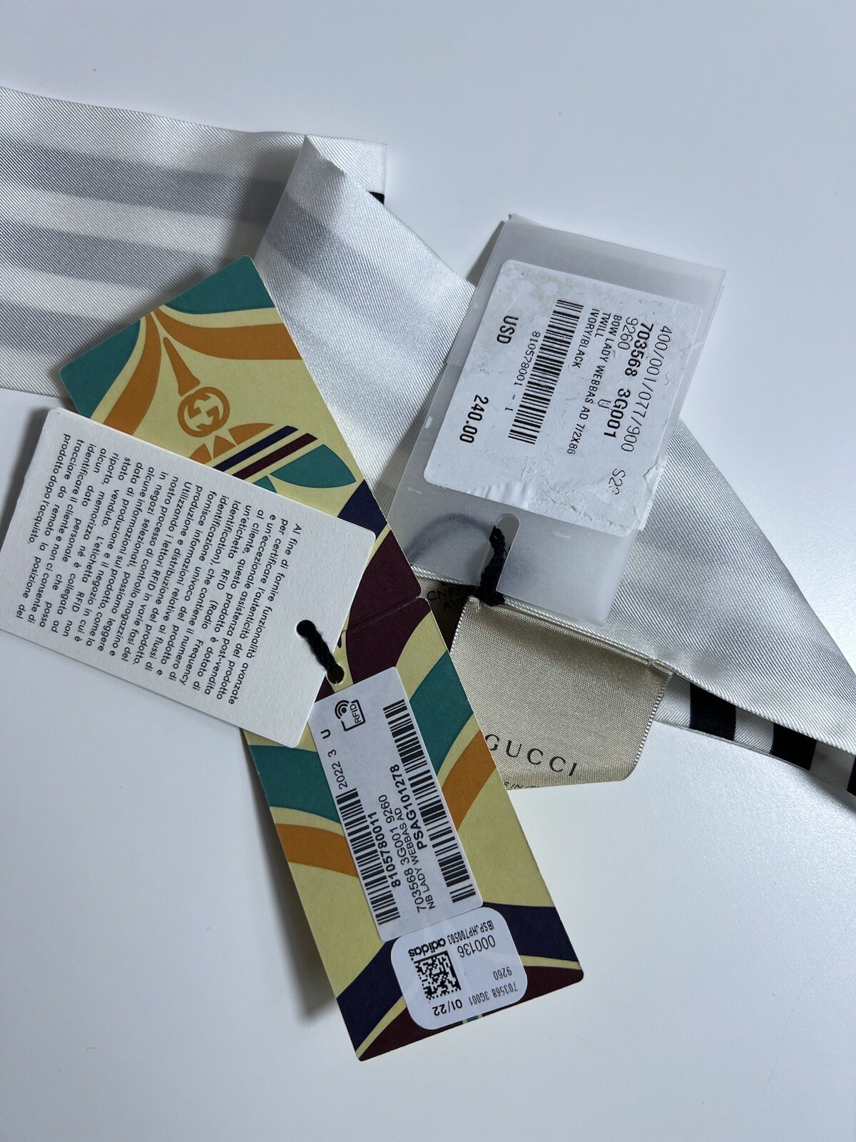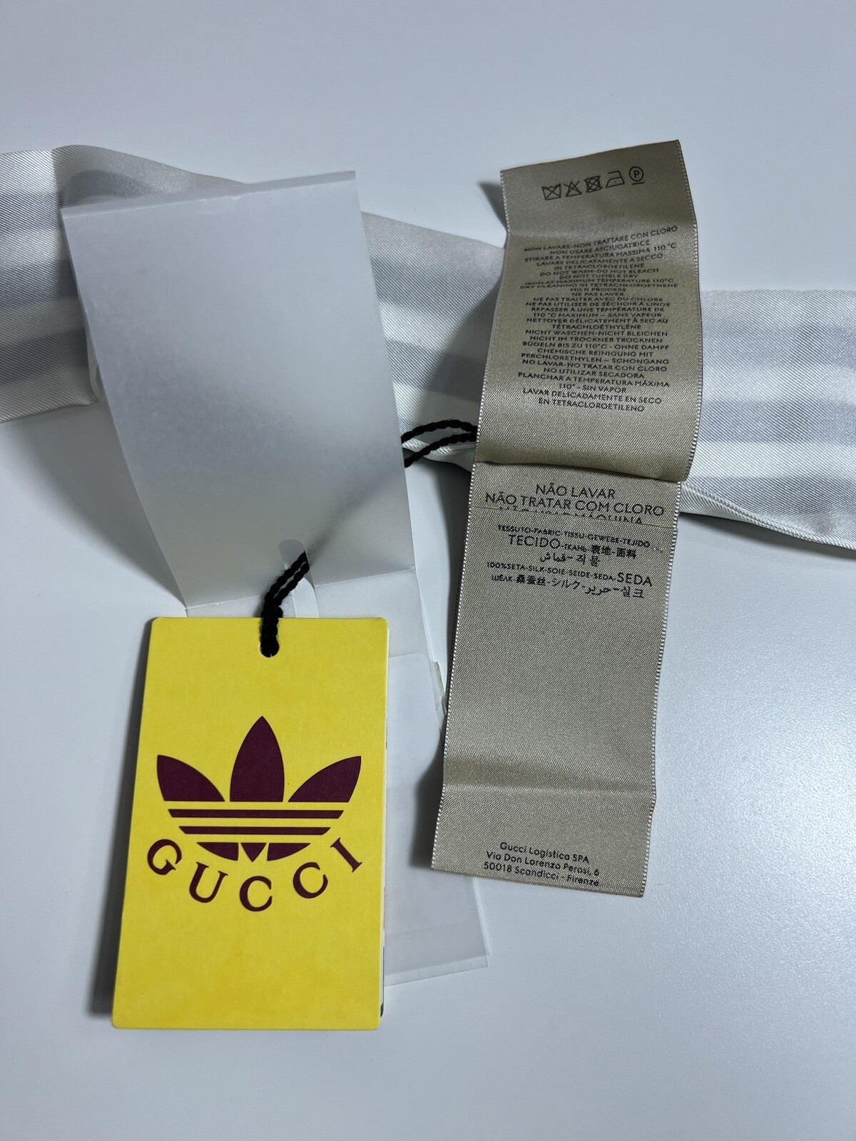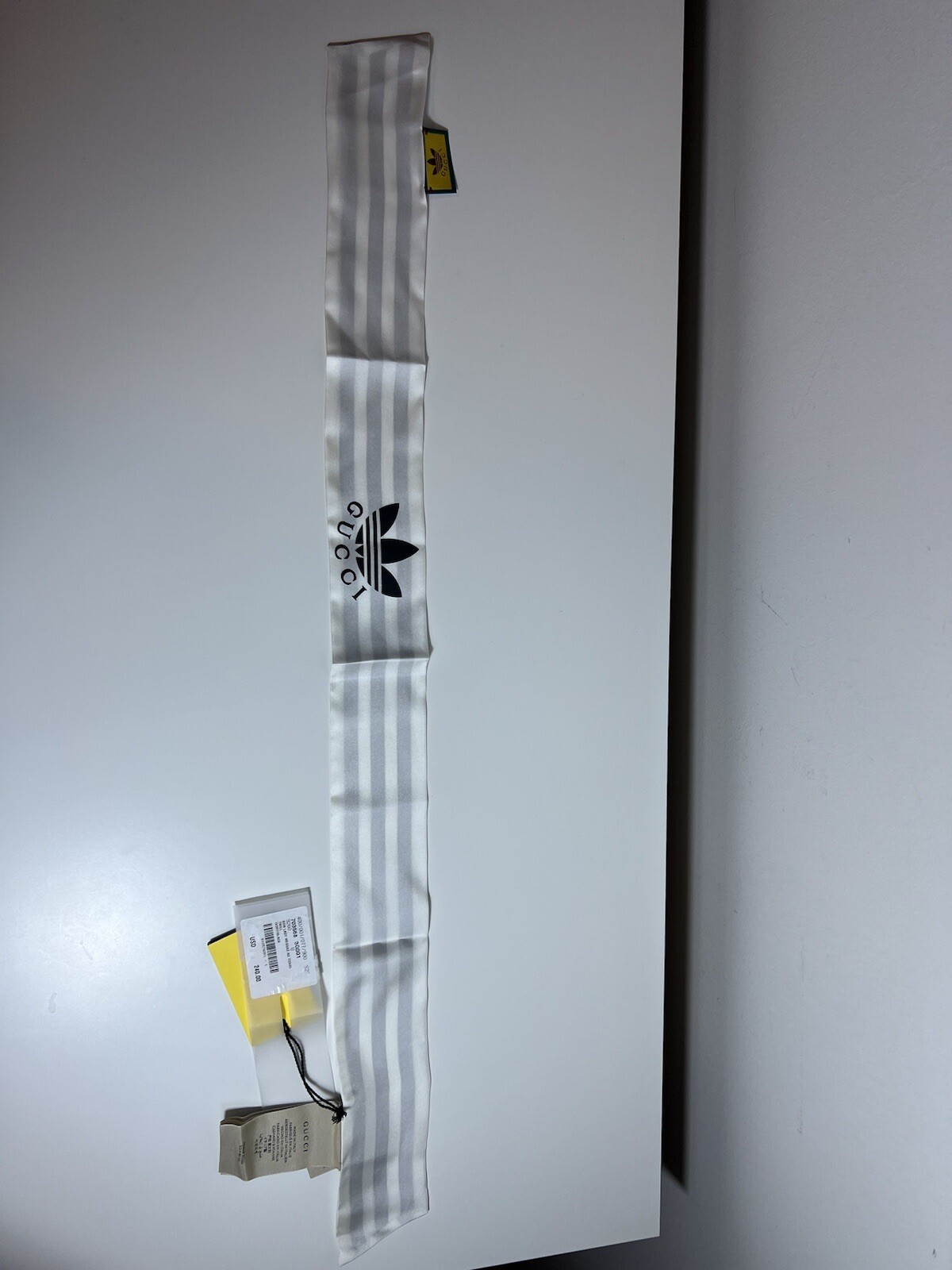 100% authentic Gucci x Adidas silk neck bow or headband in white with black stripes. Features the Adidas Trefoil and Gucci logo. Made in Italy from silk. Item is brand new with all original tags attached. Brand: Gucci x Adidas Color: White with black stripes Material: 100% silk Style: Neck bow / headband Condition: New with tags Made in Italy Includes: Original tags and labels Ships securely. Let us know if you have any questions.