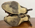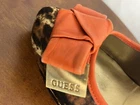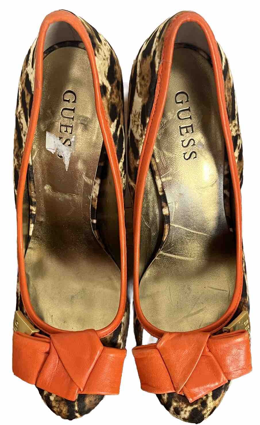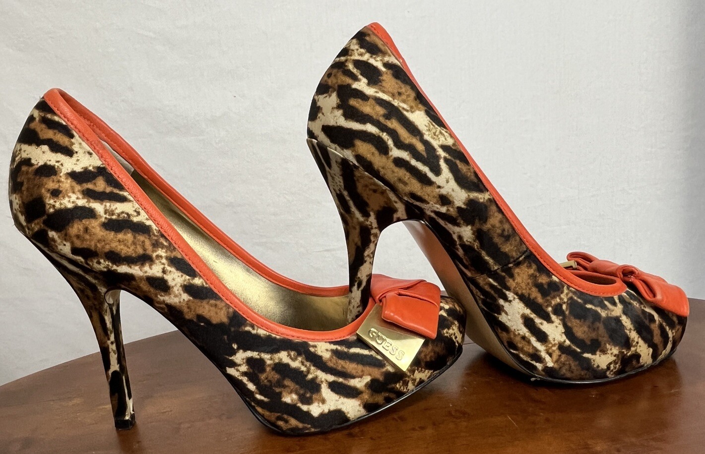 Guess Women's Leopard Print High Heels, size 7.5. Brown and black animal print with bold orange trim, bow accent, and metallic gold Guess logo plate on outer sides. 4-inch stiletto heel. Luxe gold color lining adds glam. Perfect statement heels for night out, Y2K style, or bold animal print lovers. Uppers in great condition, footbed has price sticker residue, soles have wear (see photos)