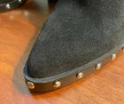 Guess Suede Booties in size 6.5, featuring a stylish ankle shaft design with a pointed toe shape and high heel height. These black booties are accented with studs for a touch of edgy sophistication. Made by GUESS, these booties have a zip closure for easy wear and are crafted from suede material. Perfect for adding a trendy flair to any outfit, these booties were worn only once and are in excellent condition. Worn once indoors. Excellent condition.