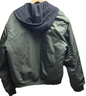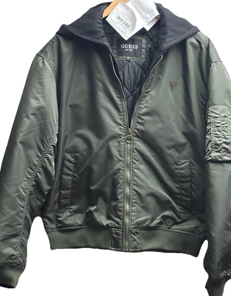 The Guess Bomber Jacket with Removable Hood is a stylish and functional outerwear piece for men in medium size. Made of durable polyester material in olive green color, this solid jacket features a zip closure and quilted accents for added detail. Designed for casual and travel occasions, it also includes zipped pockets for added convenience. The bomber jacket style is perfect for all seasons and includes insulation material for added warmth, making it ideal for activities like walking and skateboarding. With the Guess brand logo and a removable hood, this jacket combines fashion and practicality in one versatile piece.