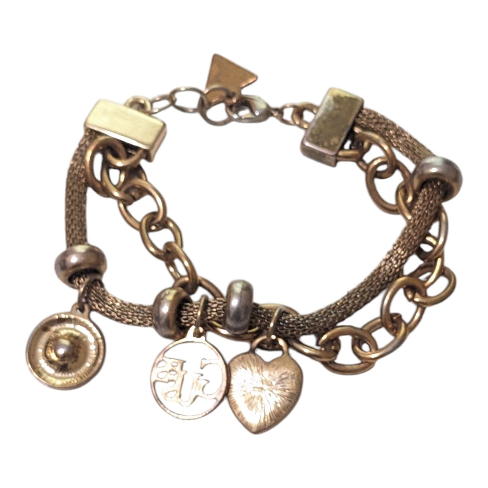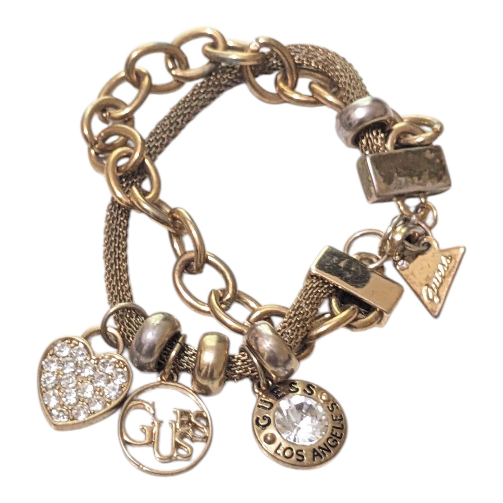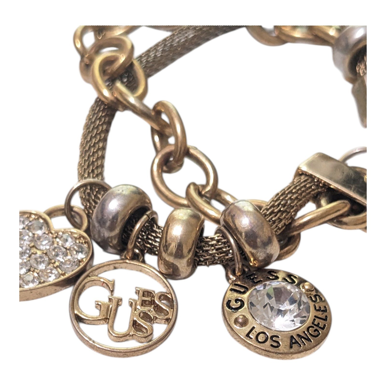 A stylish charm bracelet from Guess, perfect for adding a touch of glamour to any outfit. This gold-tone bracelet features a mix of chain and mesh links, adorned with various charms including the Guess logo, a rhinestone-studded heart, and a crystal-centered disc. The bracelet also includes decorative beads and rectangular accents, creating a layered and eye-catching design. Its secure clasp ensures a comfortable and adjustable fit, making it a versatile accessory for everyday wear. Keywords: Guess bracelet, charm bracelet, gold tone bracelet, rhinestone bracelet, fashion jewelry, women's bracelet, chain bracelet, Guess jewelry, gold bracelet, charm jewelry, designer bracelet, statement bracelet, trendy bracelet, costume jewelry