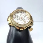 Guess Chronograph Watch with Crystals & White Leather Band Gorgeous Gold Stainless Steel Watch with Crystal Accents. White Leather Adjustable Band & Water Resistant to 100 meters Condition: VERY GOOD * Minor Wear Throughout * Water Resistant 100 meters * Needs New Battery * Model U12529L1 Materials: Stainless Steel & Leather