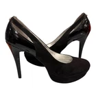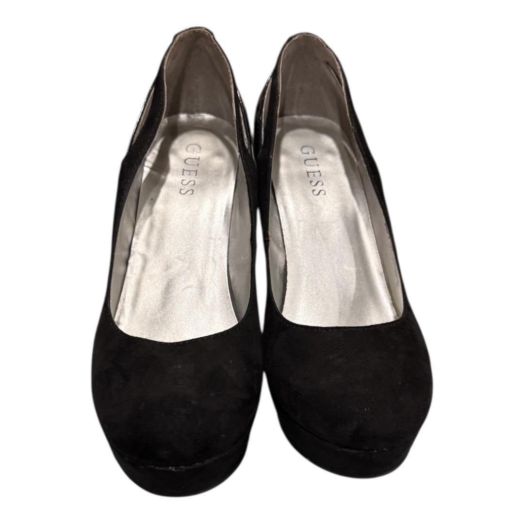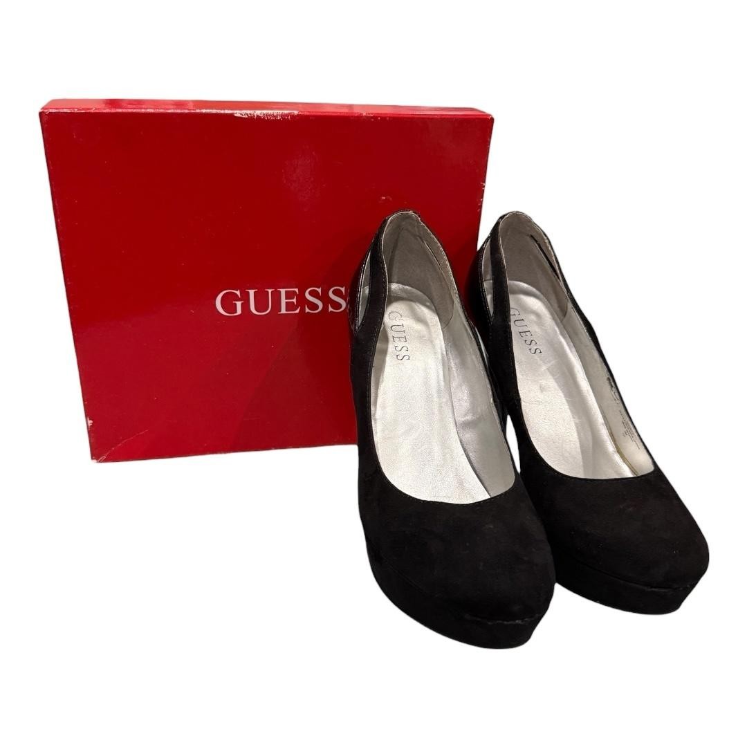 Brand: GUESS. Style: Womens platform high heel pump shoes with round toe and sleek stiletto heel. Color: Black multi fabric combining matte black faux suede uppers with glossy black patent heel counters and heels, plus metallic silver footbeds. Size: Womens US 8, medium width (marked 8M on insole and outsole). Materials: Textile and man-made faux suede upper with patent synthetic back panel, synthetic lining and metallic footbed, and man-made rubber outsoles. Details: Slip-on pump construction with covered platform front, ultra high tapered stiletto heel, low-cut sides, and rounded toe shape for a dressy, elongating silhouette. Branding: GUESS logo printed on metallic silver footbeds, small metal G logo hardware at the back of each heel, and GUESS wordmark molded into the outsoles; comes with original red GUESS shoe box and branded tissue paper. Identifiers: Style name/model GFEMELY, color name Black Multi Fabric, size 8M, textile and manmade upper, made in China, UPC: 887896244042. Condition: Pre-owned heels with light wear on soles and insoles, minor rubs to faux suede uppers, and small surface scuffs on the patent heel counters; includes original GUESS box with tissue and inner plastic packaging, and the box has scuffs and edge wear.