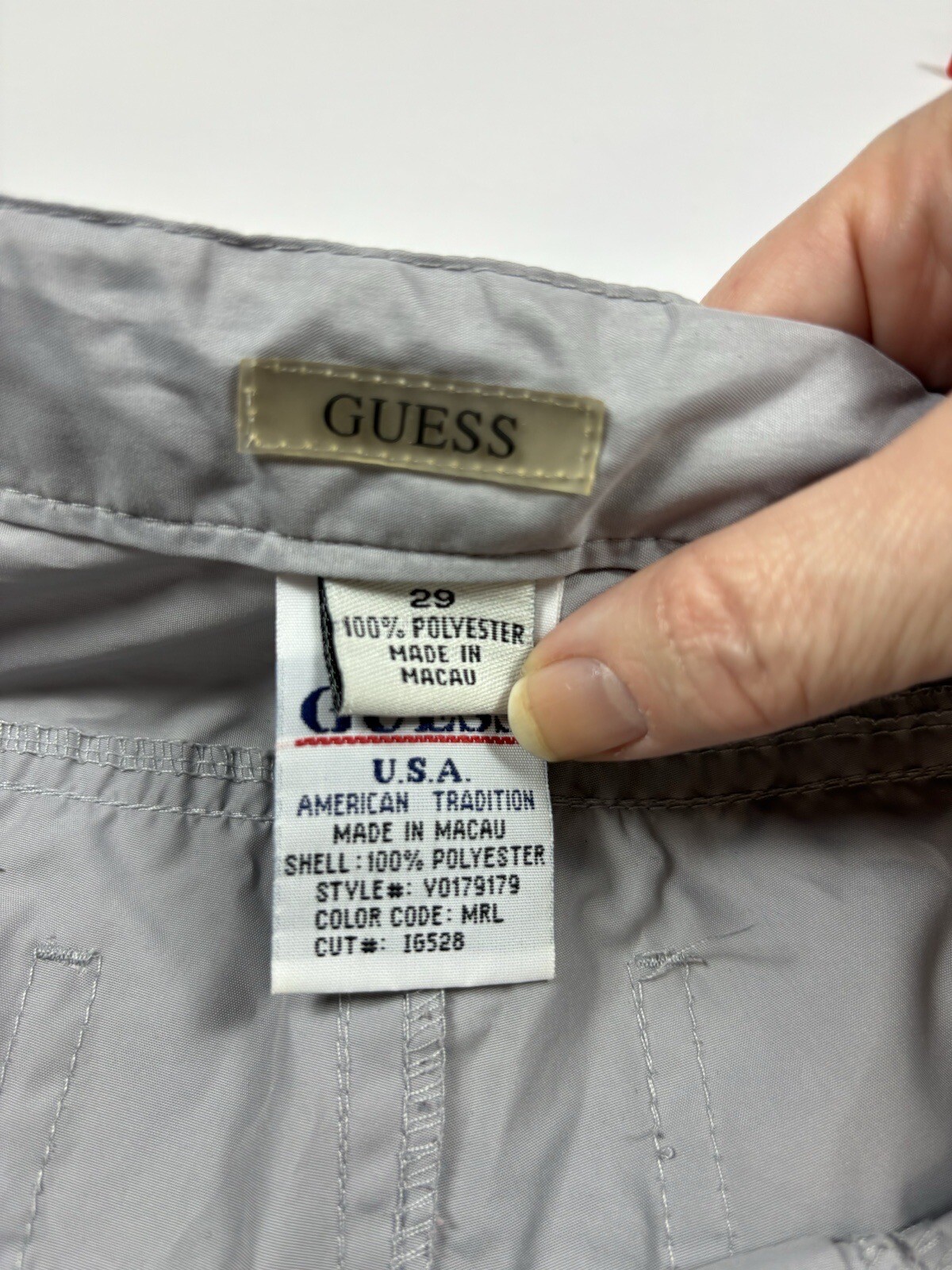 Guess Parachute Pants Light Grey 29 Wide Leg Drawstring Like New Elastic drawstring at waist & cuffs, hook & loop closure on pockets & fly Fabric Content - 100% polyester Care Instructions - Machine wash, tumble dry See photos for condition - these are like new, no flaws Size 29 - See photos for measurements G4