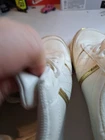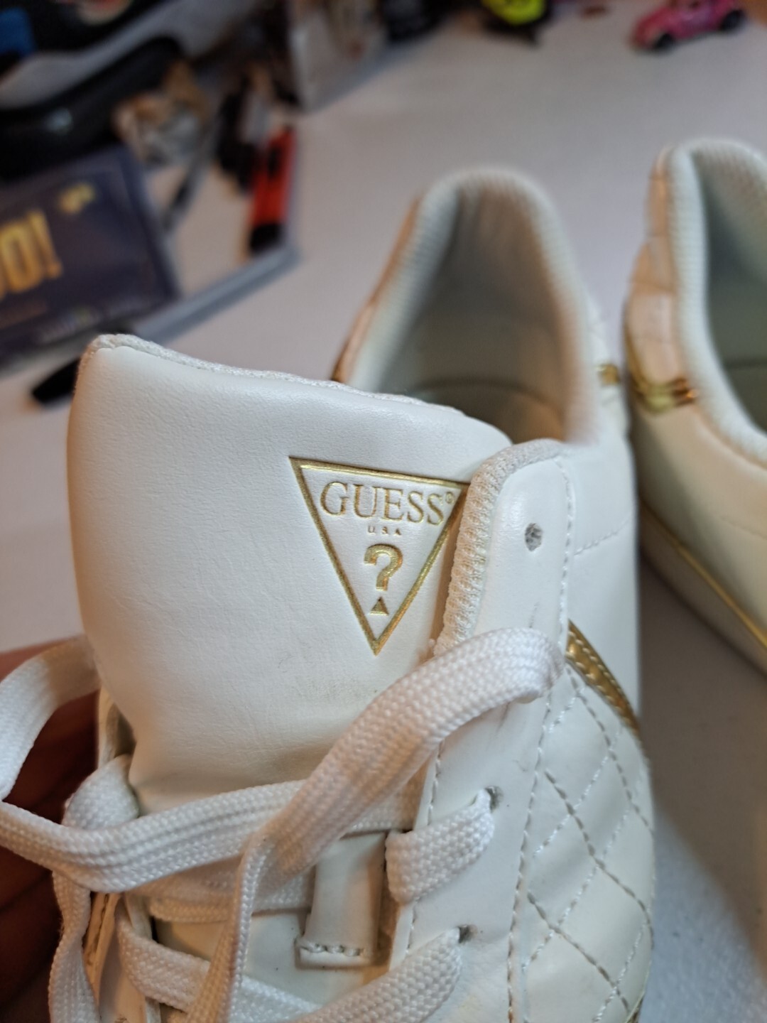 These Guess Men's Magesty sneakers are low top lace-up shoes in white with gold accents. They feature the Air Jordan 1 Mid White silhouette and offer comfort with a faux leather upper and fabric insole. The sneakers are in size 10 (US) or EUR 42.5 and are designed for walking. The style is classic and the brand is Guess.