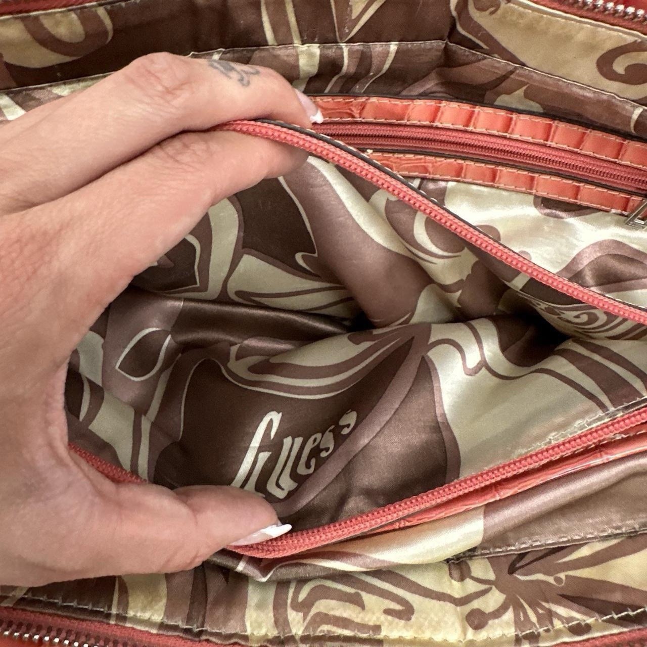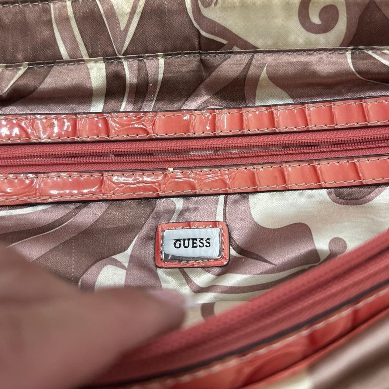 The Guess Pink Monogram Tote with Crocodile Trim is a stylish shoulder bag perfect for parties or cocktails. Made of faux leather with pink exterior material, this rectangular bag features a zip closure and double pink handles for a chic look. It also includes inner pockets for added functionality and a bag charm for a touch of flair. Perfect for women who want to make a statement at special occasions, this Guess tote is both fashionable and practical.