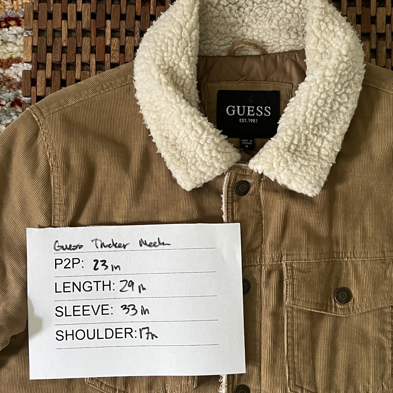 The Guess Tan Cord Sherpa Trucker Jacket is a stylish and versatile outerwear option for men in size medium. Made of cotton with a polyester lining, this solid brown jacket features a corduroy fabric type and a regular fit. The button-down style and military jacket theme make it perfect for casual occasions during the winter, fall, and spring seasons. With its classic design and quality construction, this Guess jacket is a great choice for everyday wear.