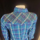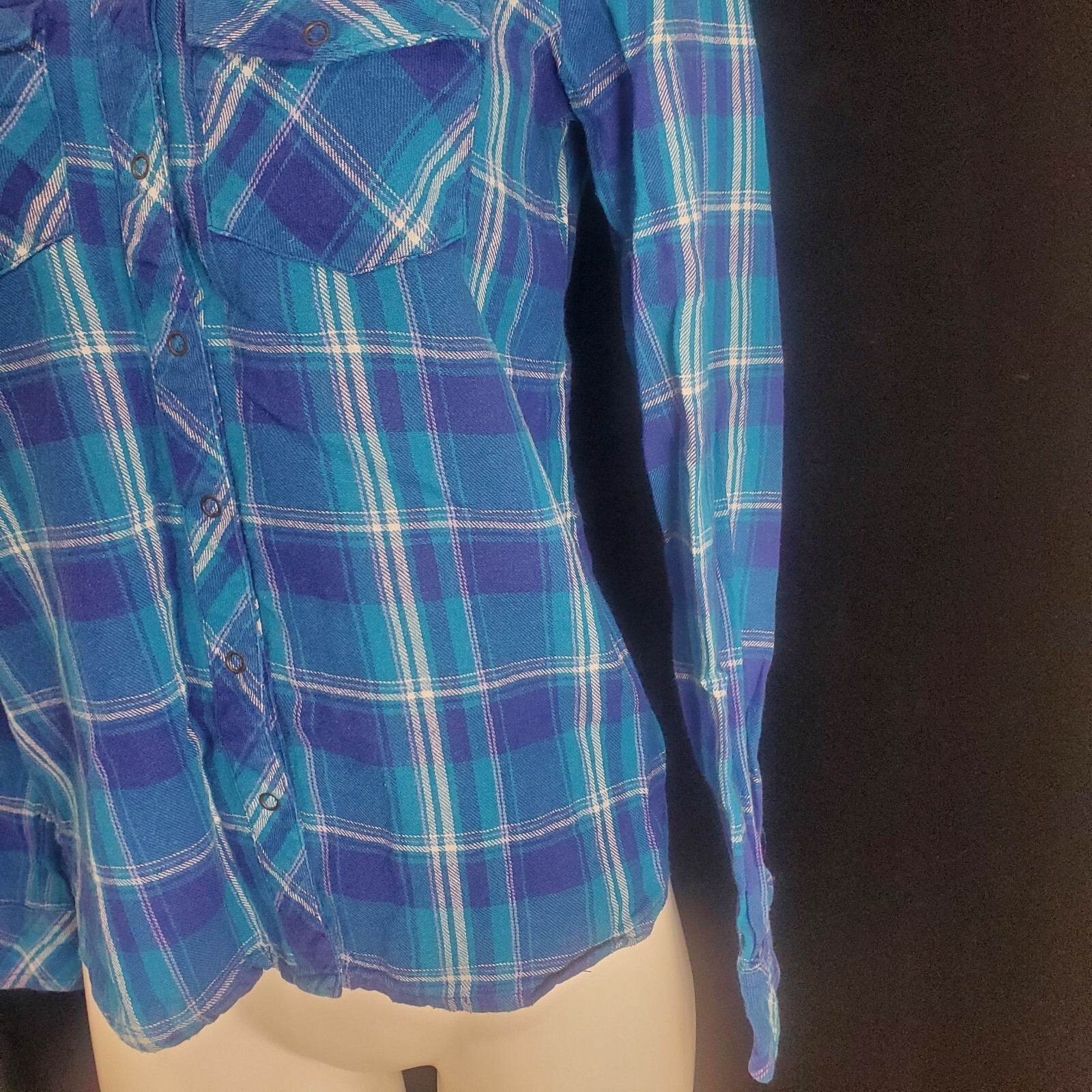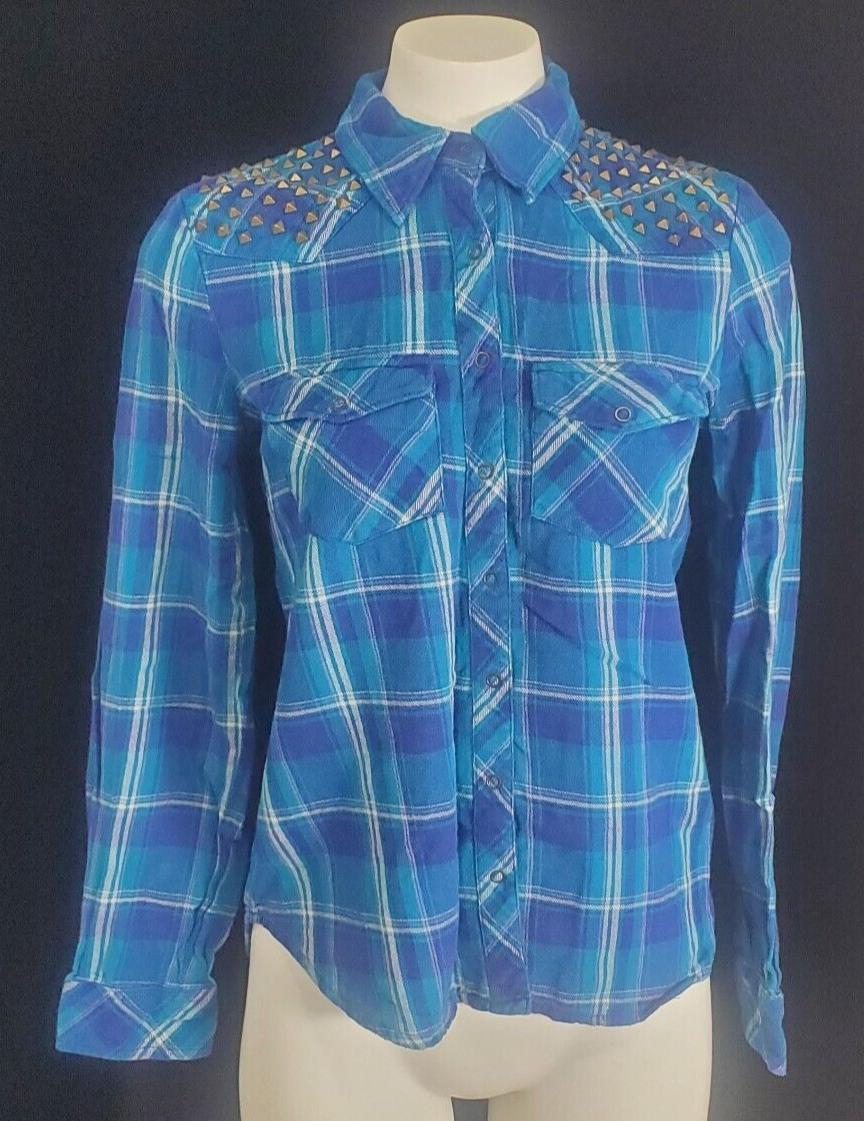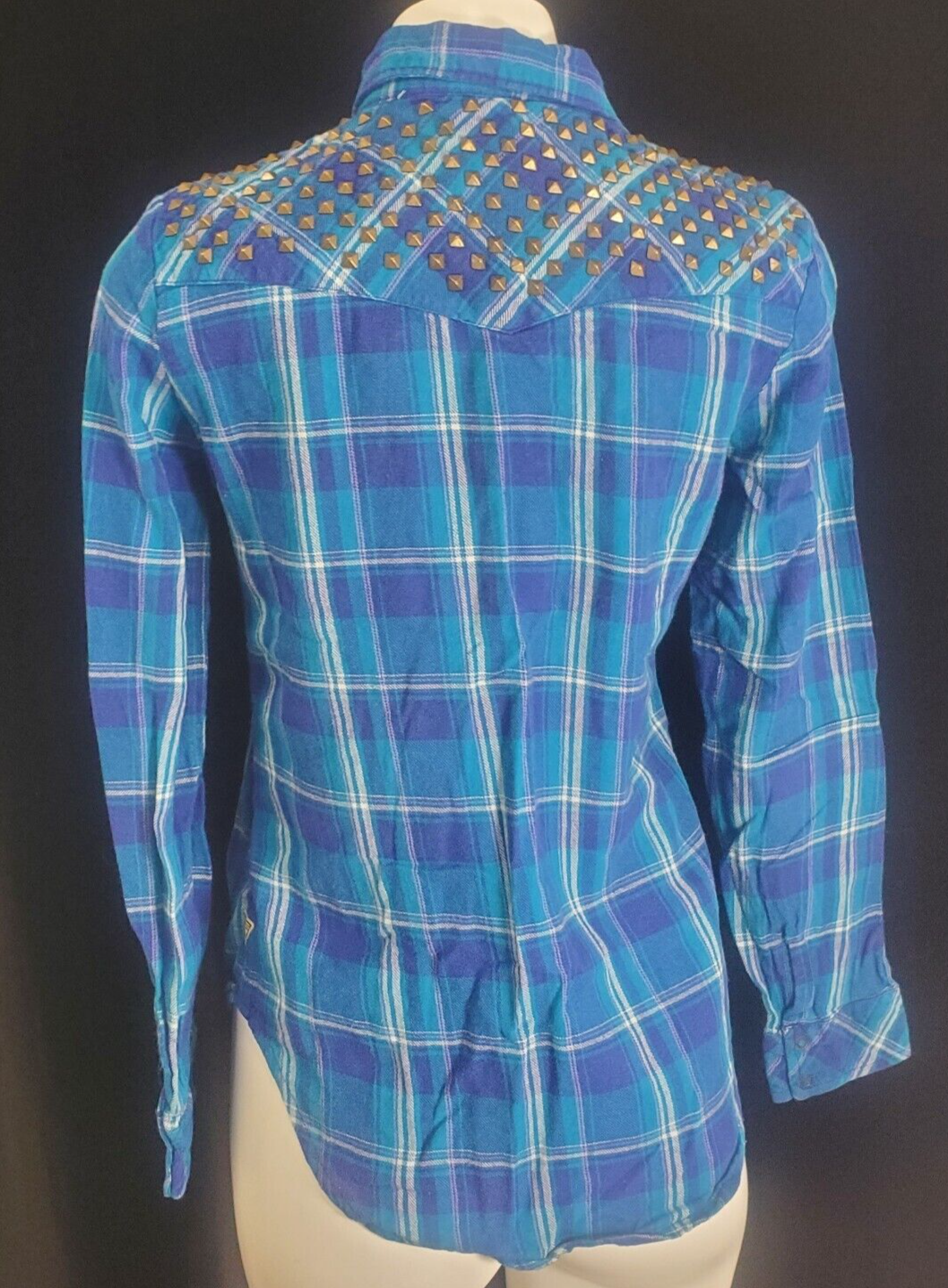 Guess Studded Blue Plaid Woman's Long Sleeve Flannel Shirt size Small. Good pre-owned condition. No rips, holes, tear, stains. Minor imperfections/flaws may possibly be observed. Care tag has been removed. Armpit to armpit:19" Shoulders: 14.5" Back of neck to hem: 25" Sleeves cuff to shoulder: 24" Neck15" to snap button. All measurements are taken with no pull on fabric. They are a best approximation as we are not professional tailors or seamstresses. Hi and welcome to my store. I always strive to offer the highest quality vintage, new, used or unique items I can find. Much of my inventory has been previously used. I always try to find the most gently used items I can find but this does mean that minor imperfections may be present. I will always try and put these imperfections in the item description. Please use the pictures as a guide to the item's condition. Be aware that due to camera limitations minor differences in color can occur. If you ever have any problems or issues with an item that you have purchased please do not hesitate to reach out to me so I can correct or address the situation. I always try and respond to or accommodate all questions about items I am selling. I will offer the fastest and safest shipping with care that I am able to. As a small reminder. I am a small one person business. I do my best to research all prices on the items I am selling. I always take condition into consideration when pricing. In most cases I welcome offers on merchandise. Please be considerate when sending offers. I have to compete with much larger organizations to stay in business. Thank you for your business and support. Have a great day I look forward to filling your order. Sincerely Coopadoopa