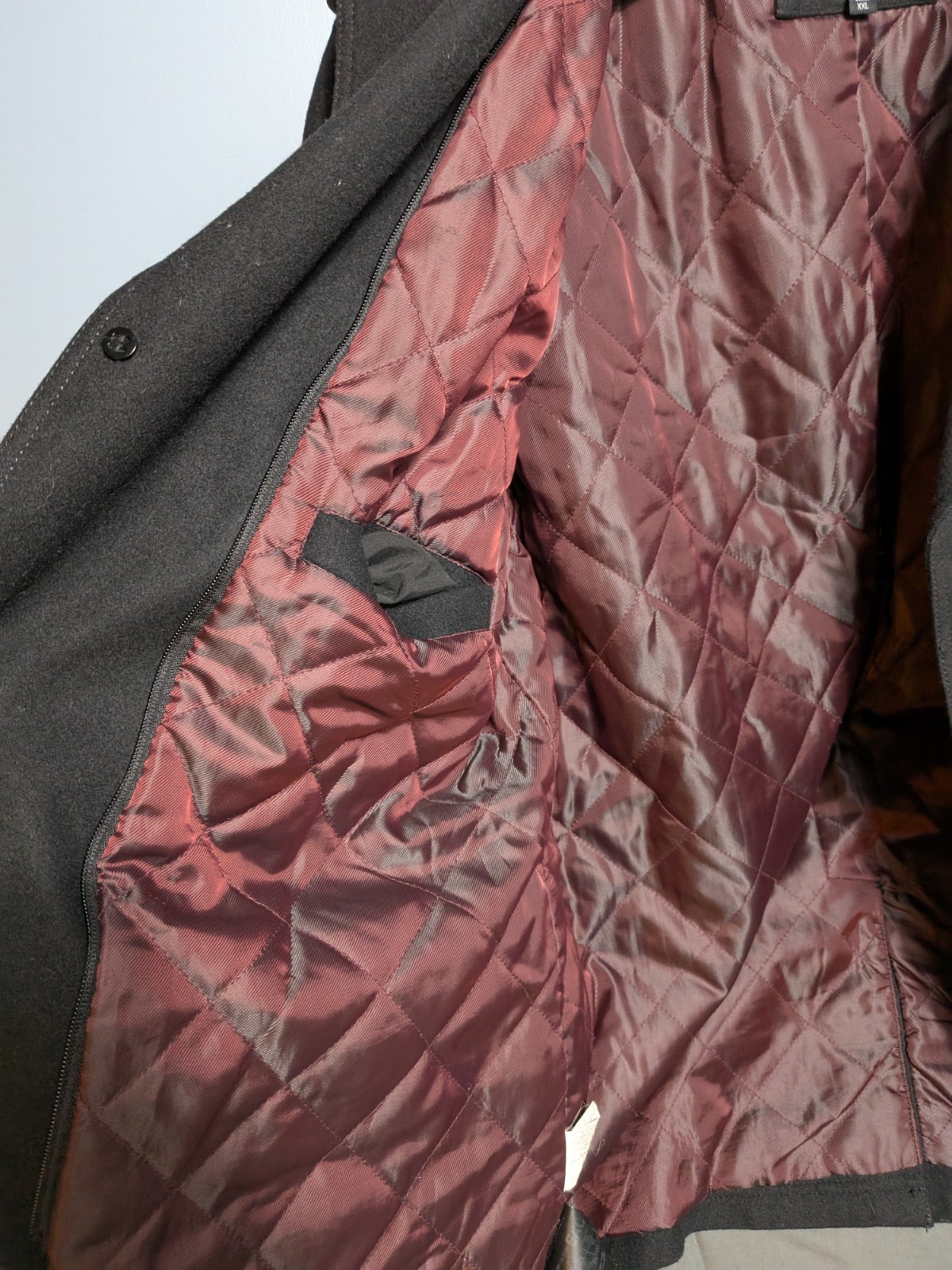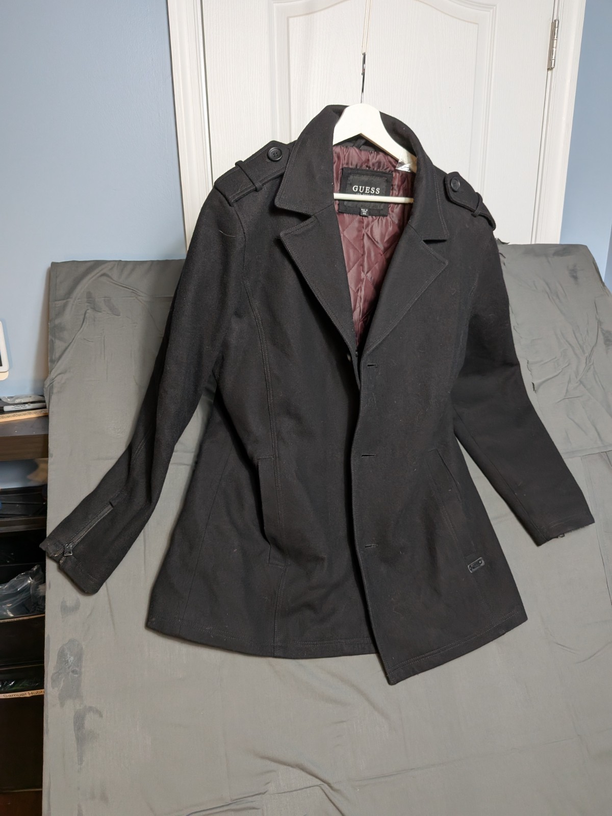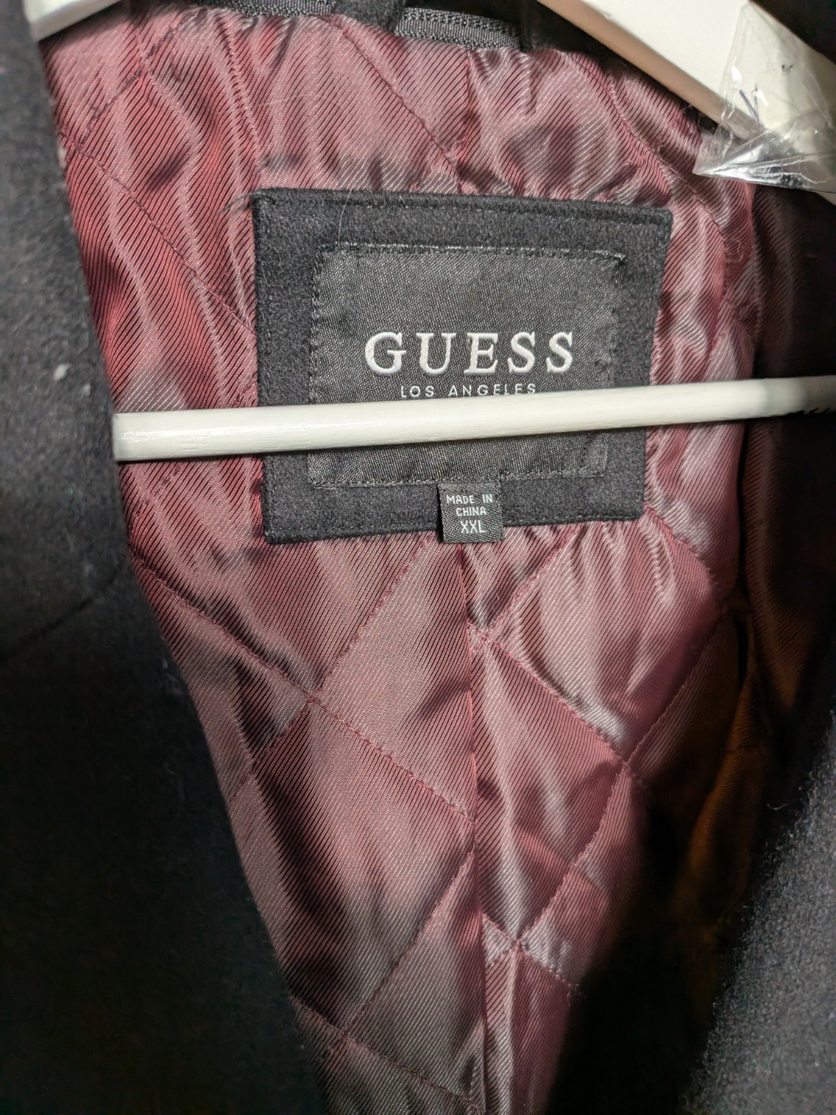 Fits more like XL as size 46. This Guess Wool Blend Coat is a stylish and practical choice for men in size XL. The black jacket features a button front closure and is insulated, making it perfect for travel and casual occasions during the winter, fall, and spring seasons. With a regular fit and long sleeves, this trench coat from the brand Guess offers both warmth and fashion for the modern man.