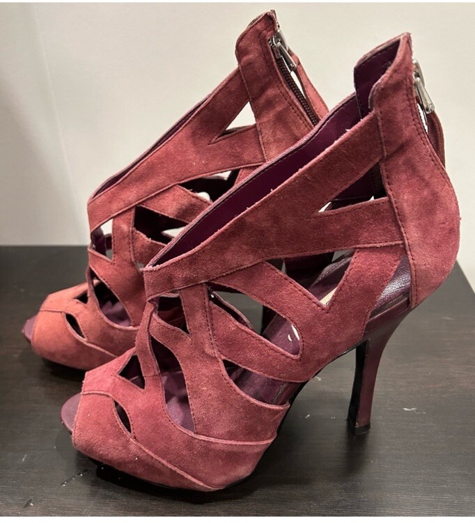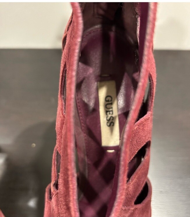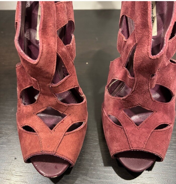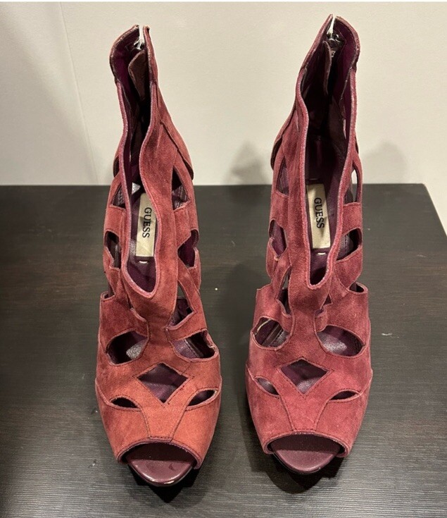 Guess Barca Cage Suede Open Toe Heels Burgundy •size 7.5 •slightly faded on one shoe