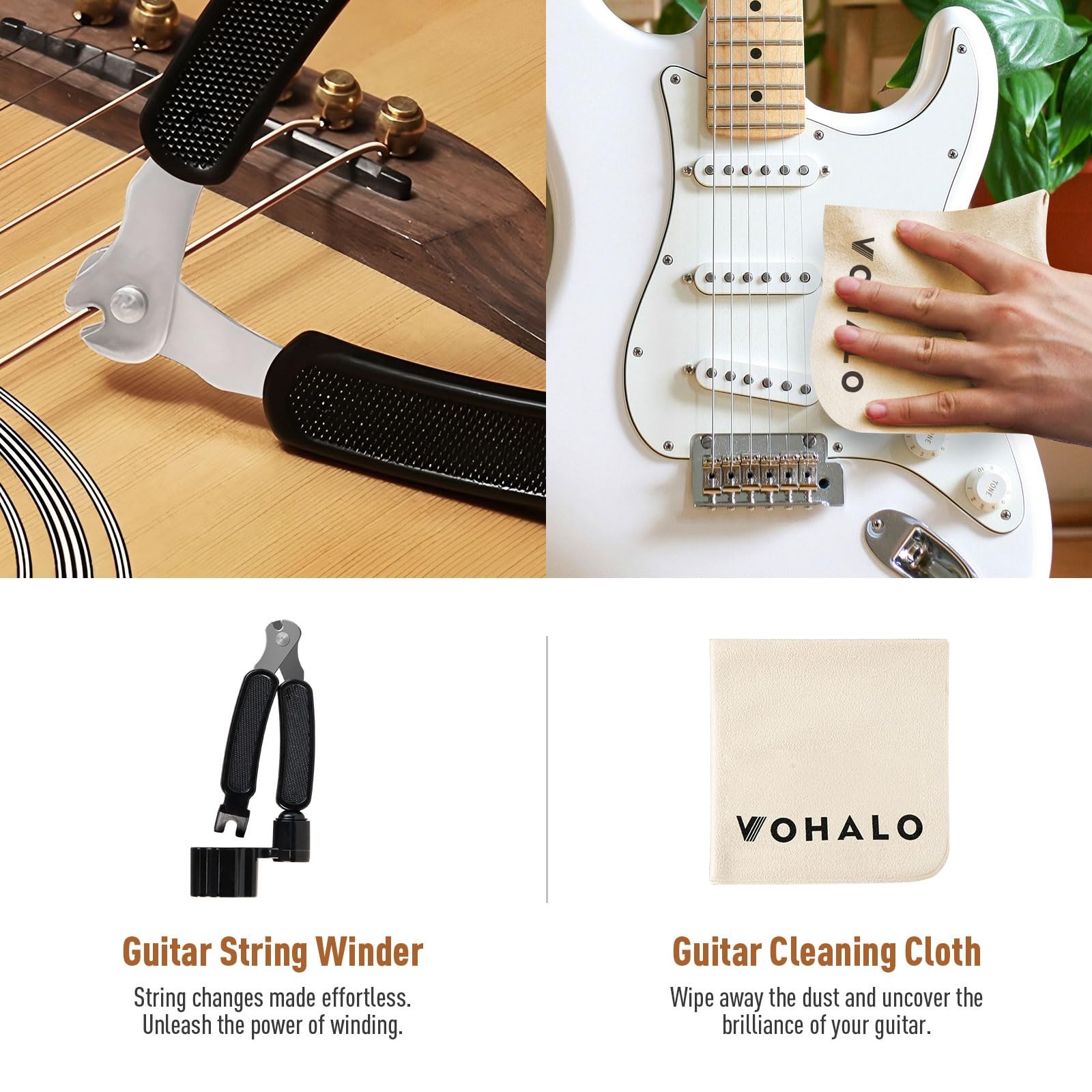 Guitar Cleaning Kit Complete Guitar Cleaning Kit: Our guitar care kit provides you with an all-in-one solution. The kit includes 2 x Guitar Cloth for cleaning, 1 x Guitar Polish Oil(60ml), 1 x Fretboard Lemon Oil(50ml), 1 x String Cleaner Oil(50ml), 1 x Guitar String Winder. Professional Guitar Cleaning Kit: Our Kit features a professional way that thoroughly removes dirt from guitar strings, restoring the instrument's original tone. The conditioner effectively prevents shinling on the strings,extending their lifespan. Wood Whisperer Formula: Our product uses harmless ingredients that won't cause any damage to the guitar's surface or wood. You can confidently use these products to provide comprehensive care for your guitar without compromising its sound quality or appearance. Easy to Carry: Compact professional-grade bottles with nozzle controls deliver 20% more applications per ml than bulkier kits, perfect for studio sessions, gigs, and touring musicians. Suitable for Various Instruments: our ALL IN ONE kit is designed to meet your various needs. It's suitable for a variety of stringed instruments, including guitars, basses, ukuleles, and more. This essential guitar accessory keeps your instrument durable and sounding great.
