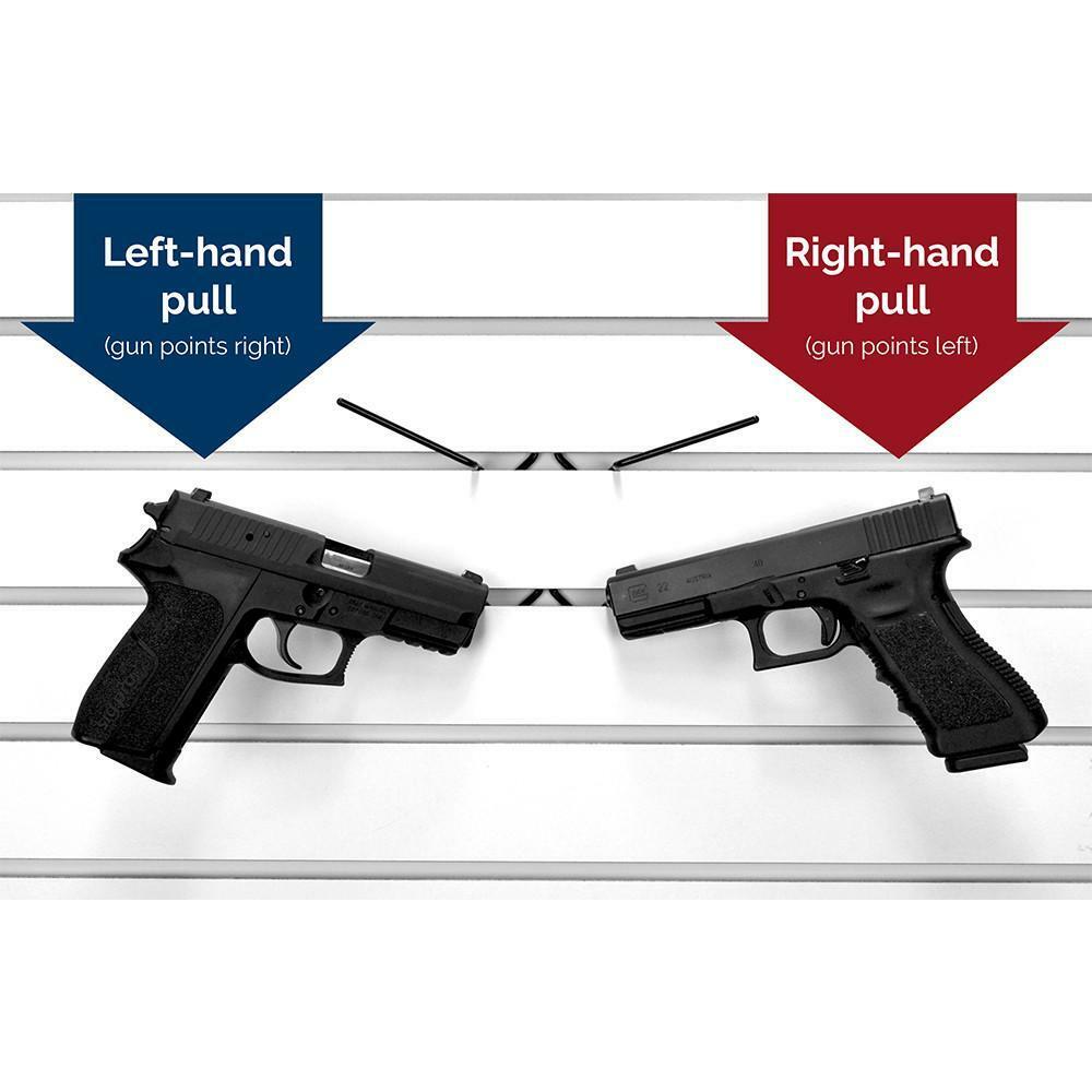 The Slatwall Snipers fit onto most** slatwall to display handguns. The simple, clean design disappears when mounted with a gun and holds the gun at an angle that is easy to access. With the ability to overlap guns on display, the Slatwall Sniper can increase the capacity of a given space. Great for use in gun shops and vault rooms. For use on fiberboard slatwall* Vinyl coated wire Fits guns as small as 22 caliber *Please Note: Some particleboard slatwall utilize metal tracks inside the slats. In this case, Snipers cannot be inserted on the face of the board. If you are able, slide the Snipers in from the edge of the board. There are several new plastic or metal slatwall brands available and we have found Slatwall Snipers do not work with: MegaWall Gladiator GearTrack Proslat