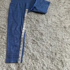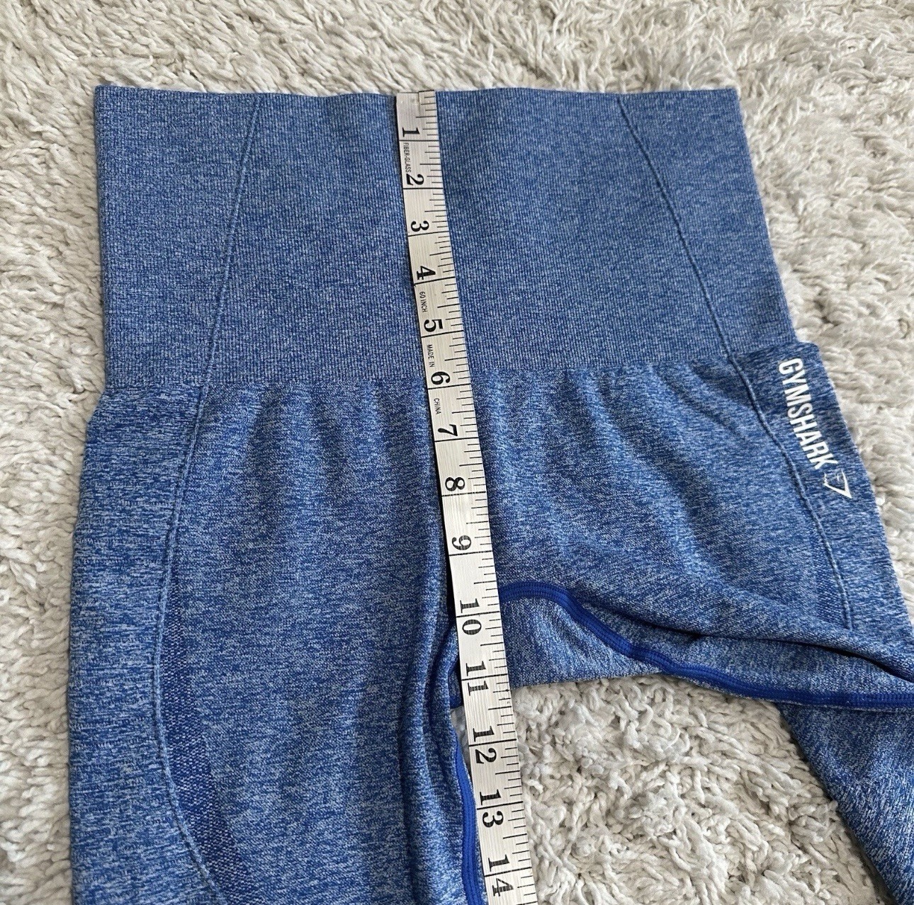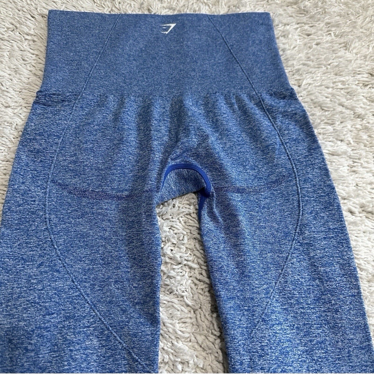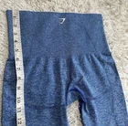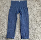 The Gymshark High Rise Seamless Crop Leggings in blue are designed for women in size small. These leggings feature a solid pattern with a pull-on closure, making them easy to wear during activewear occasions. Made from a polyamide blend, these leggings offer a comfortable and athletic fit, perfect for gym and training activities. The laser cut detailing on the legs adds a stylish touch to these cropped leggings, which are machine washable for easy care.