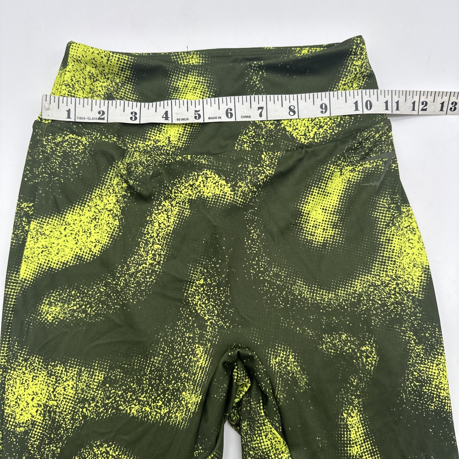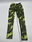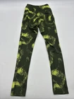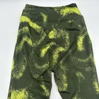 Gymshark leggings for women in size small, featuring a green camouflage pattern with yellow accents. These pull-on leggings are made of polyester and spandex for a stretchy and athletic fit. The ankle-length leggings have a skinny leg style and are suitable for activewear, including gym training, CrossFit, and yoga. Perfect for a sporty and stylish athleisure look. Check pictures for flaws and measurements