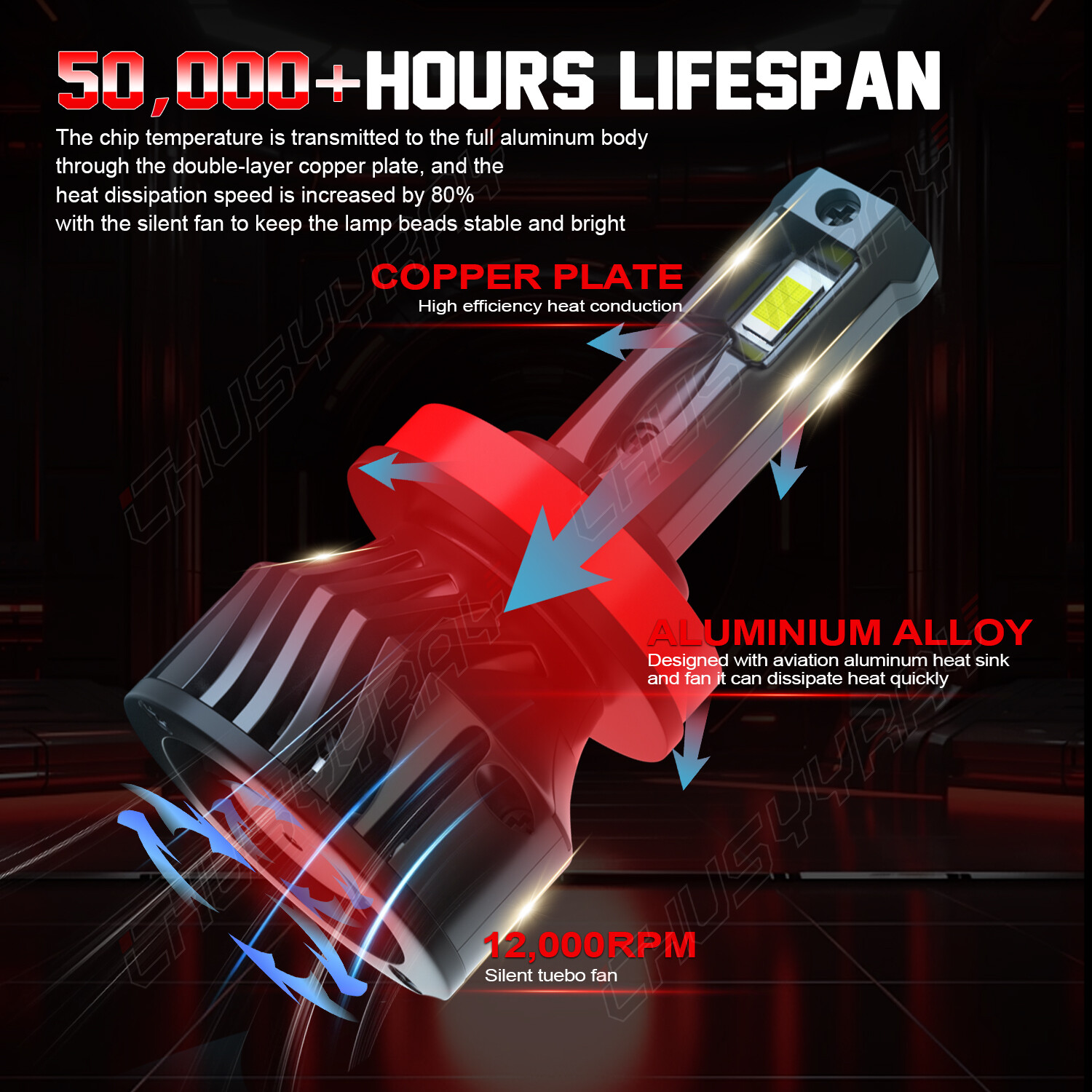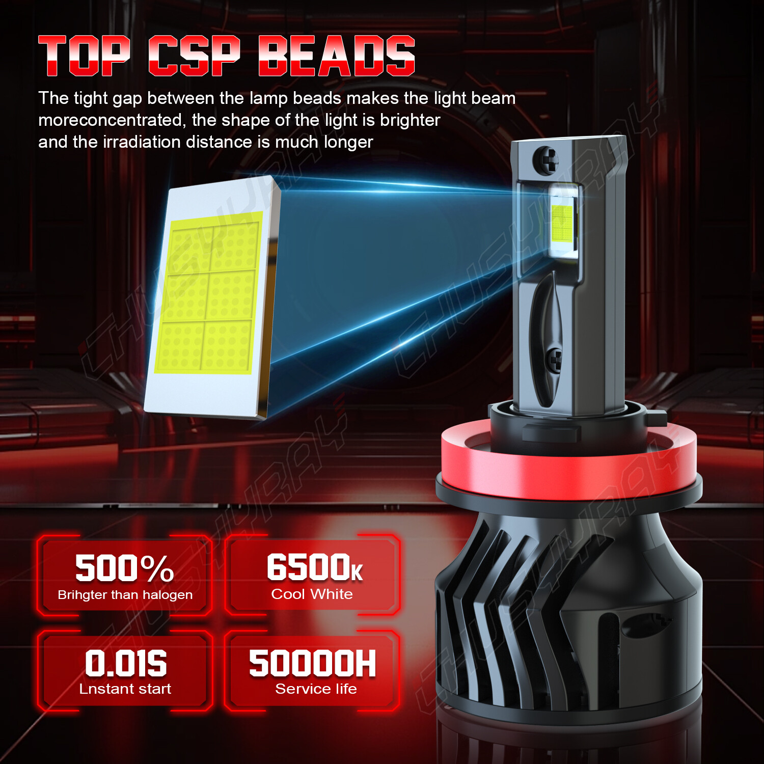 Purchase Notes: Please check your original lights before purchase to avoid the situation of different models in the same car, the model combination of this link is H11/H8/H9 HIGH/LOW BEAM Specification: Bulb Type: H11/H8/H9 (High/Low Beam) Color temperature: 6000K white Beam Angle: 360 Degree Working Temperature: -40-150 degree Voltage: DC 9V~32V, much more stable than normal LED bulbs, longer lifespan Heat Control: Aluminum Body Lifetime: >50000 hrs Waterproof: IP67 Lumens: 10000 lm per Bulb Top Features Noiseless: CHUSYYRAY V5plus series without fans at the bottom of led bulbs, which provides you a quiet driving environment and does not affecting the heat dissipation of the lights. Super Bright: 50W, 10000LM, 6000K per pair, 200% brighter as original halogen bulbs. (Don't be fooled by high lumen ratings, CHUSYYRAY V5plus Series LED bulb was designed with correct optical focus for increased output, functional beam, no added glare.) Plug and Play: 5 minutes installation, Polarity free: Same design as halogen, wireless, easy to install without any modification. Efficient Cooling System: Whole aviation aluminum body, unique hollow-carved heat sink design with Intelligent IC make sure the LED conversion kits last longer. Waterproof: IP67 water resistant and designed for use in heavy rains, rainproof housing, can work even in extreme situations. Parcel Content: - 2 * H11/H8/H9 LED Headlight Bulbs On Mar 24, 2025 at 01:27:43 PDT, seller added the following information: