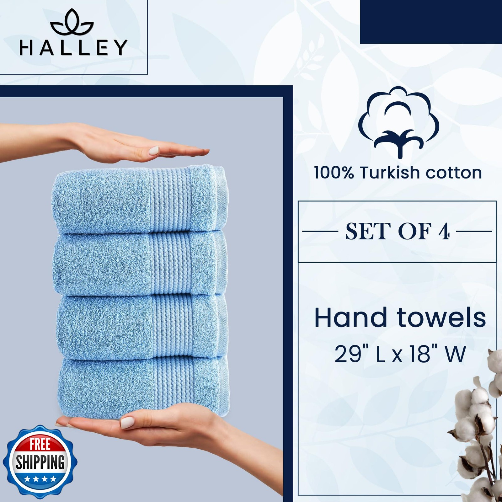HALLEY Turkish Cotton Towels (Pack of 4) Hand Towels Super Soft Highly Absorbent 100% Cotton Towels for Bathroom and Kitchen for Mother’s Day (Powder Blue) Features Ultra Soft Turkish Towel Set: Indulge in our 100% cotton towels, crafted for ultimate comfort and warmth. Experience softness and convenience with bath towels, hand towels, and washcloths. Quick-Drying Cotton Beach Towel: Highly absorbent 100% cotton towel dries fast after showers or swims. Sand-proof design is ideal for hassle-free beach outings. Durable 650 GSM Quality: Experience premium quality and durability with our towels. Double-stitched for longevity, they're crafted with all-natural dyes for lasting color, even after multiple washes. Eco-Friendly Turkish Towels: Crafted from 100% pure cotton, our towels are OEKO-TEX and ISO 9001 certified, ensuring no harmful chemicals are used. Safe for you, your family, and the environment! Easy Care: Machine washable for convenience. Wash in cold water before first use to enhance absorbency. Tumble dry on low heat or air dry. Avoid fabric softener and bleach to maintain softness. Shipping Free & Fast Shipping: We offer free shipping to most of the USA with a normal delivery time of 3-7 days. However, due to the current situation, additional delivery time (up to 3 weeks) may be required for some items. Alternative Carriers: We may use alternative carriers (e.g., USPS, FedEx, UPS) to ensure your package arrives safely and on time. Due to the use of multiple carriers, we are unable to provide a tracking number automatically. Handling Time: Orders are processed and shipped within 1-2 business days of receiving cleared payment. Shipping Restrictions: Shipping to Alaska, Hawaii, Puerto Rico, Guam, and other US territories may incur shipping charges or delivery restrictions. Please contact us before ordering, or your order can be refunded/cancelled. State Restrictions: Certain items may not be shipped to California due to state regulations. Contact for Tracking Updates: If you require tracking updates or have any concerns about the delivery of your order, please feel free to contact us, and we will be happy to assist you. Return Policy 30-Day Hassle-Free Returns: If you are not completely satisfied with your purchase, you can return the item for free within 30 days of receiving it for a full refund or exchange. Easy Return Process: Contact us, and we will provide you with a prepaid return shipping label and detailed instructions. No Restocking Fee: There are no restocking fees for returns. However, the buyer is responsible for return shipping costs if the return is not due to a seller"s error. Refund Processing: Refunds will be processed within 1 business day of receiving the returned item in its original condition. Feedback Your feedback is extremely important to us. We strive to provide the best products and customer service possible. If you are satisfied with your purchase, please take a moment to leave us a positive review. If you have any concerns or issues with your order, please contact us before leaving negative feedback. We are committed to resolving any problems and ensuring your satisfaction. Contact Us If you have any questions or concerns, please feel free to reach out to our customer support team. You can contact us through the eBay messaging system. We are available Monday to Friday, 9:00 am to 5:00 pm EST, and we will do our best to respond to your inquiry within 24 hours. Thank you for supporting our small family business!
