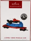 HALLMARK LIONEL TRAINS 6650 MISSILE CAR DIE-CAST METAL CHRISTMAS ORNAMENT 2022 HALLMARK 2022 LIONEL TRAINS 6650 MISSILE CAR KEEPSAKE ORNAMENT DIE-CAST METAL AND MIXED MATERIALS, WHEELS THAT TURN, SWIVEL THE MISSILE LAUNCHING RAMP IS A MUST HAVE THE LIONEL TRAIN FANS *NOTE, THE MISSILE DOES NOT MOVE UP AND DOWN THE BOX SHOWS IT IN DOWN POSITION BUT MADE IN LAUNCH POSITION ✨✨✨✨✨ GREAT DESIGN AND DETAIL✨ WOULD MAKE A GREAT GIFT ADD TO YOUR COLLECTION Will ship to you with great care. Will ship to the United States and Protectorates via USPS International shipments will ship via Ebay's Global Shipping Program (GSP) International packages will ship within one business day to eBay's GSP. eBay's GSP will then ship the package internationally. Handling and Shipping times may vary with GSP. Brought to you by The VinKris Collection
