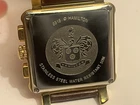 HAMILTON LLOYD QUARTZ CHRONOGRAPH - REF 6318 - UNUSUAL SHAPE SQUARE GOLD PLATED CASE - IN FULL WORKING ORDER - NEW BATTERY FITTED EXCELLENT CONDITION SQUARE GOLD PLATED CASE - ONLY VERY LIGHT WEAR MARKS - ORIGINAL LEATHER STRAP WITH SIGNED DEPLOYMENT CLASP - ONLY VERY LIGHT WEAR MARKS MINT CONDITION TEXTURED DIAL WITH APPLIED STYLISED NUMBER HOUR MARKERS - 3 SUBDIALS - 30 MINUTE COUNTER AT 10 - 1/10 SECOND COUNTER AT 2 - SUB SECONDS AT 6 - DATE AT 4 CASE DIAMETER - 38MM WITH THE SIGNED CROWN EXCELLENT CONDITION DOMED CRYSTAL - FEW VERY TINY SCRATCHES 22 JEWEL ETA QUARTZ CHRONOGRAPH MOVEMENT UNUSUAL UNCOMMON HAMILTON TAKE A LOOK AT THE OTHER WATCHES I HAVE FOR SALE