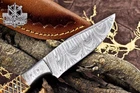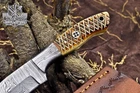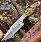 Custom Hand Made DAMASCUS STEEL HUNTING KNIFE WITH FULL CAMEL BONE HANDLE We offer a shipping discount for More then one purchased . And discount will be apply on combine invoice, Discount will not apply on separate payment. ITEM DETAILS OVER ALL LENGTH 9.0 inches long (Approx) HANDLE LENGTH 4.5 inches long (Approx) BLADE LENGTH 4.5 inches long (Approx) BLADE HARDNESS 58-60 HRC Which Holds The Sharp Edge For Long Time. HANDL CAMEL BONE WITH DAMASCUS BOLSTER COVER LEATHER SHEATH This Awesome custom made KNIFE has a nice hand forged with the combination of 4340 & 1080 steel. HOW OUR DAMASCUS IS MADE: All our Damascus is real and not just an acid etch. Damascus is a mixture of 1080HC and 4340 nickel carbon. You heat them up together and then fold the bar over and over to get the desired layers, ours are 396 layers. Then you burn the blade in acid, and it turns the nickel satin color and the high carbon turns blackish gray. This is how the layers are exposed to show the layers of the new steel created coined "Damascus". All Damascus is acid etched to show the layers. If you high polish the metal it will be shinny satin like all steels. Only after you burn the sides of the blade with acid do you see the layers of the two steels. Makes sense? After we make our knives we high polish the handles and put an edge on the blade. The high polishing buffs off the acid burned layer of the handle, and the blade edge is sharpened and the acid burned edge becomes satin. You can re-burn the tang of the blade near the handles and the edge of the blade and it will show the layers once more. All our knives are hand made, durable and unique ***** YOU WILL RECEIVED THE SAME KNIFE Qality Standards Our Damascus blades are made from high quality non-stainless steels which rival or exceed any Damascus blade made from the 10 series with 4340. Our Damascus combination has taken years to perfect and has been tested under a variety of application which will offer professional performance in categories of toughness, strength (lateral stress) and edge honing and holding ability. In a 5 spot Rockwell test our blades will average near or close to 58 which offers a perfect balances between its toughness and strength.Our blades due to carbon content need to be regularly treated with wax and/or 3 in 1 oil to maintain its superior quality. Questions if you have any question feel free to send us message we aim to answer all questions within 24 hours Feedback If you are not satisfied with our service please contact us before leaving any negative or natural feedback. We will resolve all issues as quickly as possible. Disclaimer We are not responsible for any injuries associated with the use of our tools. Our products are intended for legal use only by responsible buyers. Therefore, we will not sell our products to anyone under the age of 18. Before bidding please check your country laws as some countries Custom don't allow this. If your purchase is held by Custom Authorities in your country/State we will not be responsible for that and no refund will be issued Shipping We offer a 20% shipping discount for More then one purchased . And discount will be apply on combine invoice, Discount will not apply on separate payment We ship within 24 hours after receiving complete payment but this can be delayed due to week ends or Governments and Religious Festivals . . This is beyond our control and we apologize for this inconvenience. Precautions Our Tools are very sharp so open and use them very carefully We are not responsible for any injuries associated with the use of our tools Tips to Care knife 1. NEVER STORE YOUR KNIFE FOR LONG TIME IN LEATHER SHEATH. 2. LEATHER CAN ABSORB WATER, WHICH WILL RUST THE KNIFE. 3. ALWAYS CLEAN THE BLADE AFTER USING WITH OIL OR WAX
